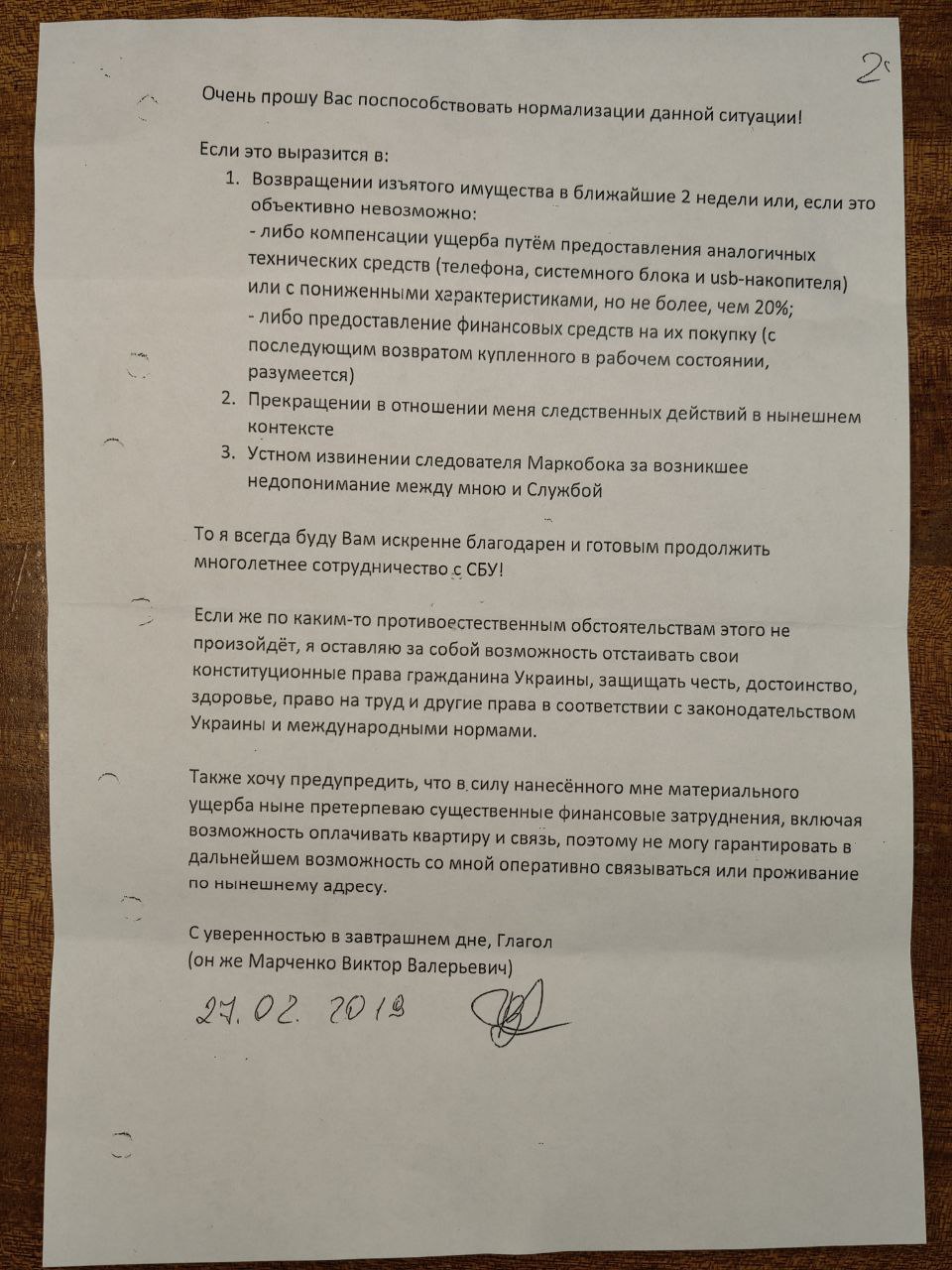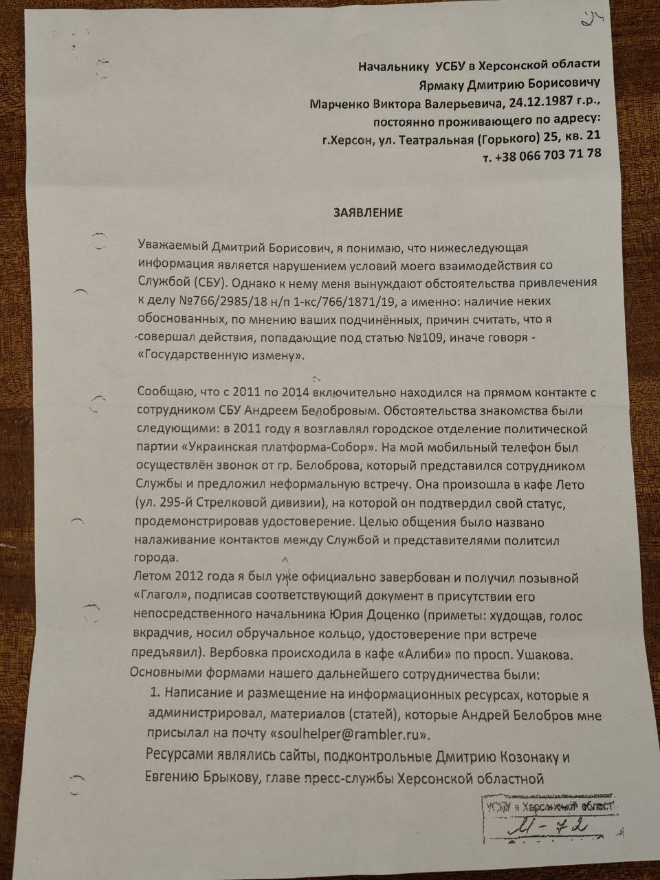 Ничего странного не заметили? Агент СБУ Виктор Марченко (агентурный псевдоним Глагол), экс-глава херсонского отделения политической партии «Украинская платформа — Собор», входившей в оппозиционное Виктору Януковичу объединение «Комитет сопротивления диктатуре», пишет начальнику УСБ на русском языке. Это не перевод, на последнем листе стоит собственноручная подпись. Штамп внизу первого листа тоже весьма своеобразен.