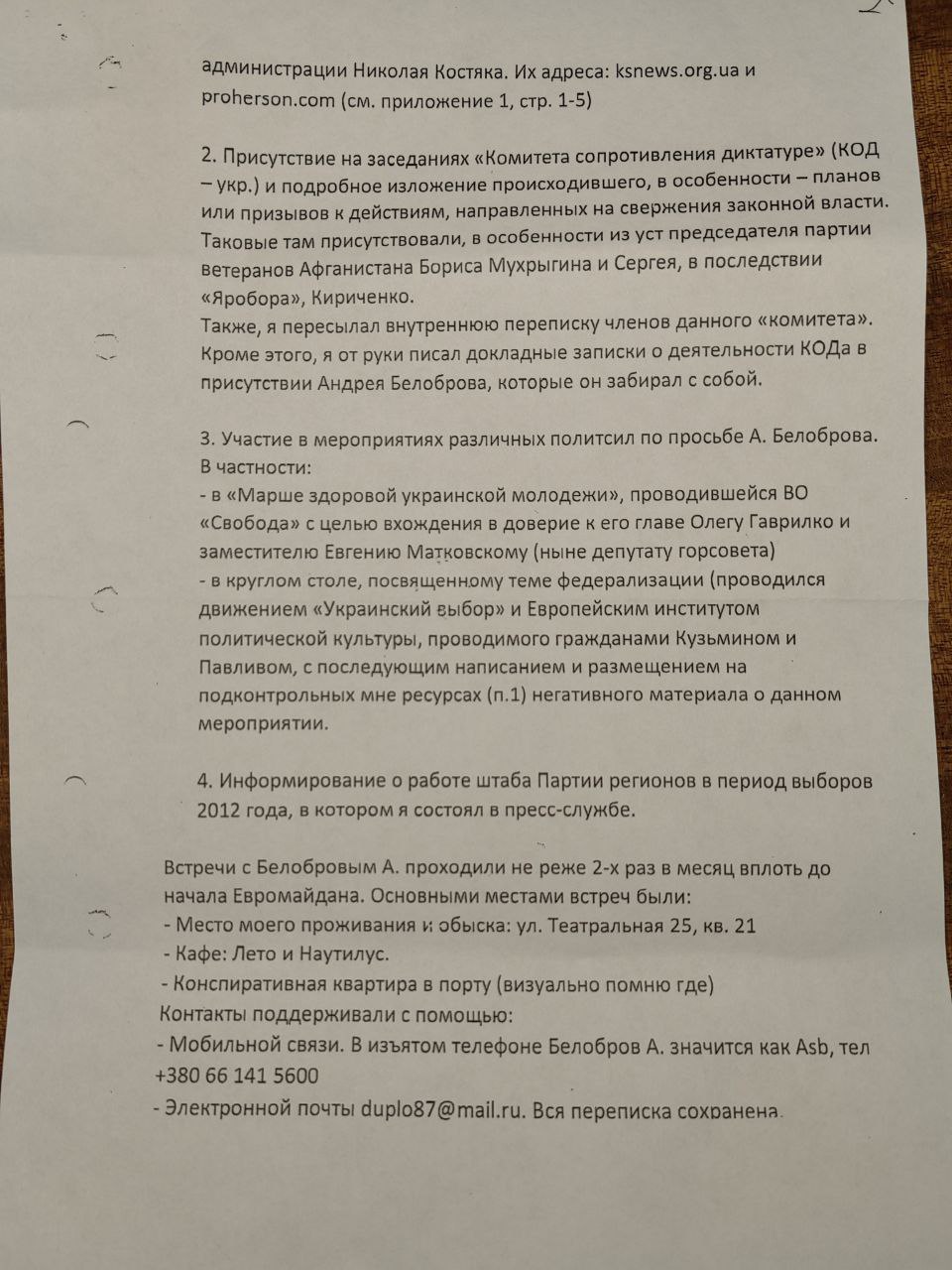Документ, показанный Безсоновым, представляет собой заявление завербованного агента на имя начальника управления СБУ в Херсонской области. Содержание его не особенно интересно, гораздо любопытнее, как он выглядит.