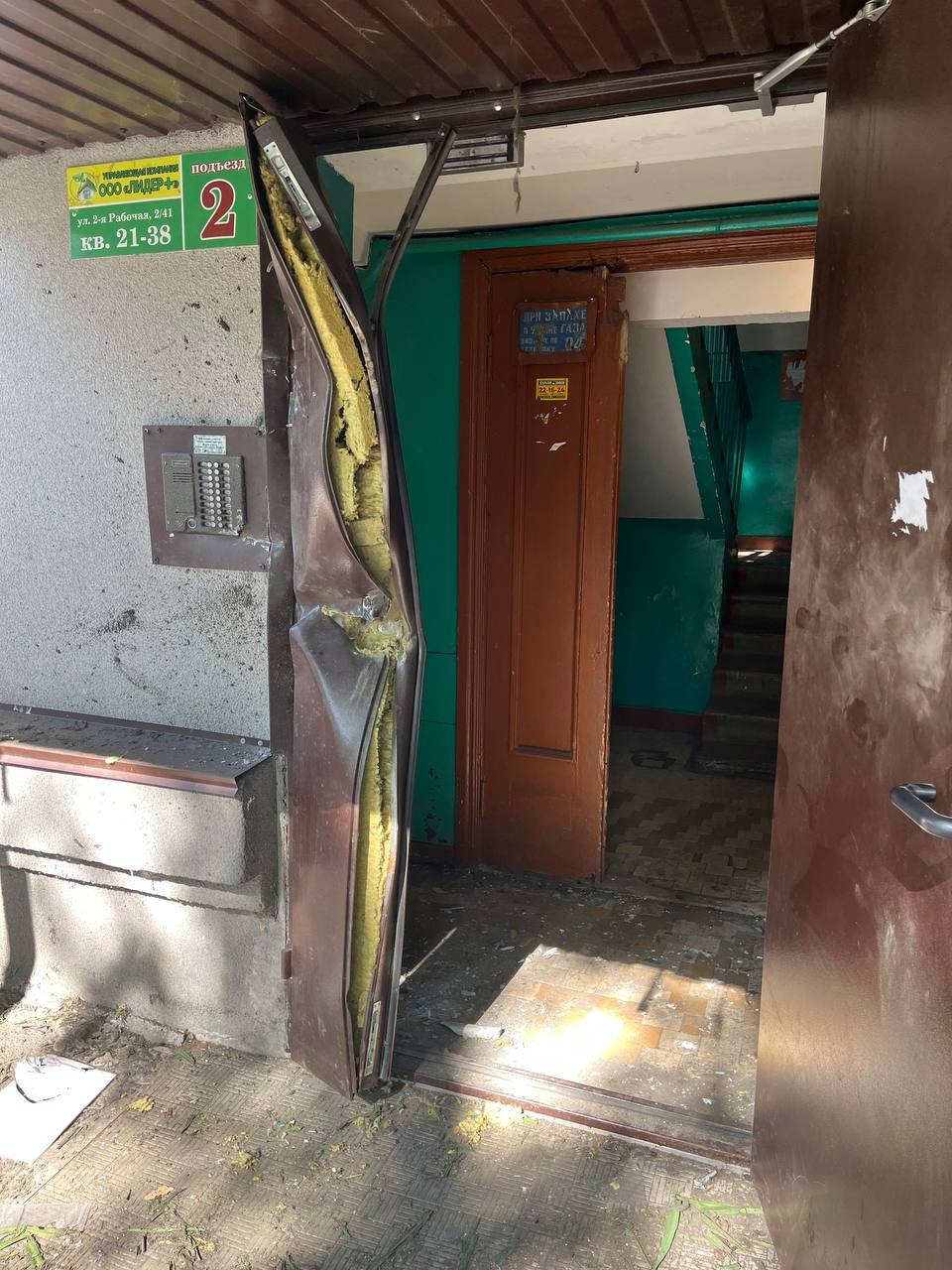Однако повредило подъезд, вероятнее всего, именно российская ПВО — в ночь атаки в местном паблике «Курский Бомондъ» были опубликованы фотографии и видео с продавленной металлической дверью того самого подъезда с фотографий Старовойта. Рядом с дверью прямо у входа в подъезд лежал отработавший маршевый двигатель от ЗУР 9М335 ЗРПК «Панцирь-С1» — российского комплекса ПВО.