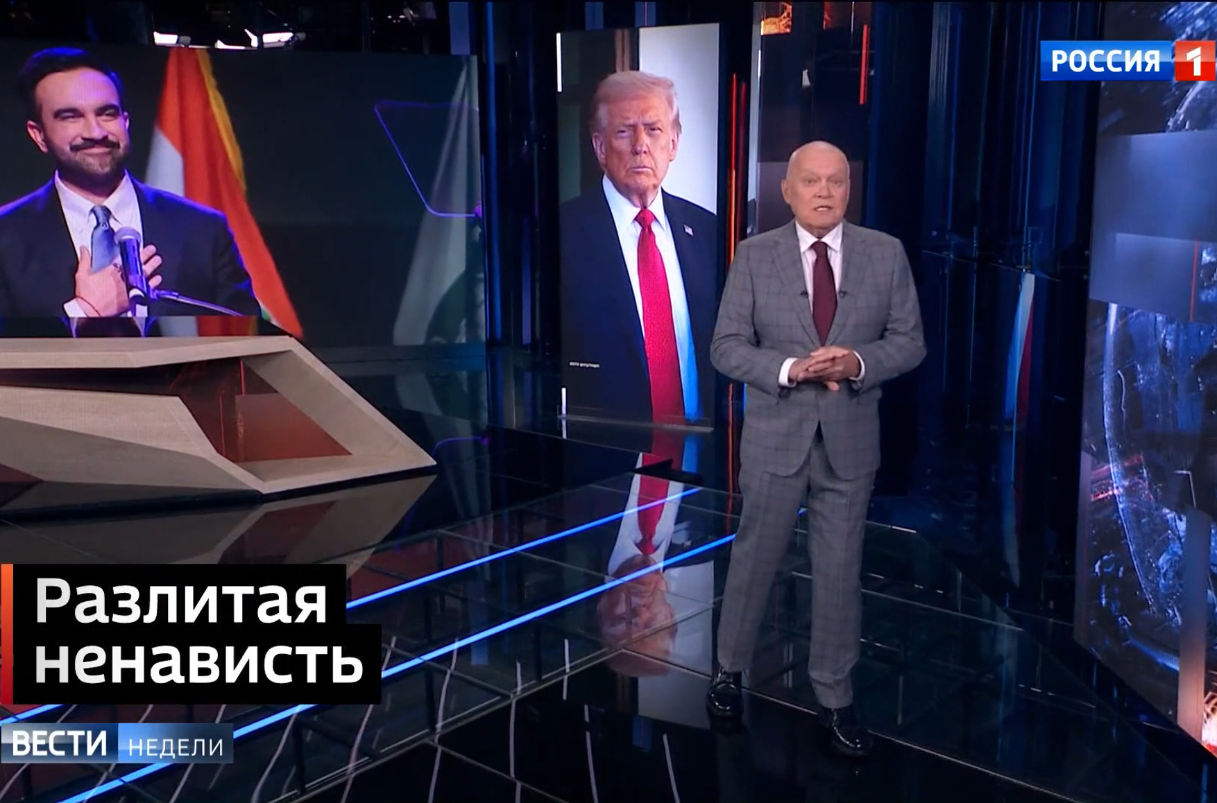 Дмитрий Киселев в сюжете «Вестей недели», посвященном обстановке в США на фоне избрания мэром Нью-Йорка Зорана Мамдани, рассказывает: