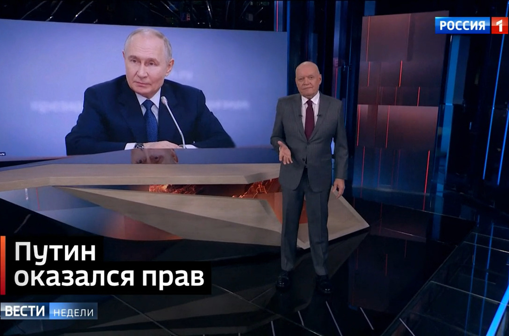 Один из монологов Дмитрия Кселева в «Вестях недели» озаглавлен «В Европе начали осознавать правоту Путина». Кремлевский обер-пропагандист рассказывает:
