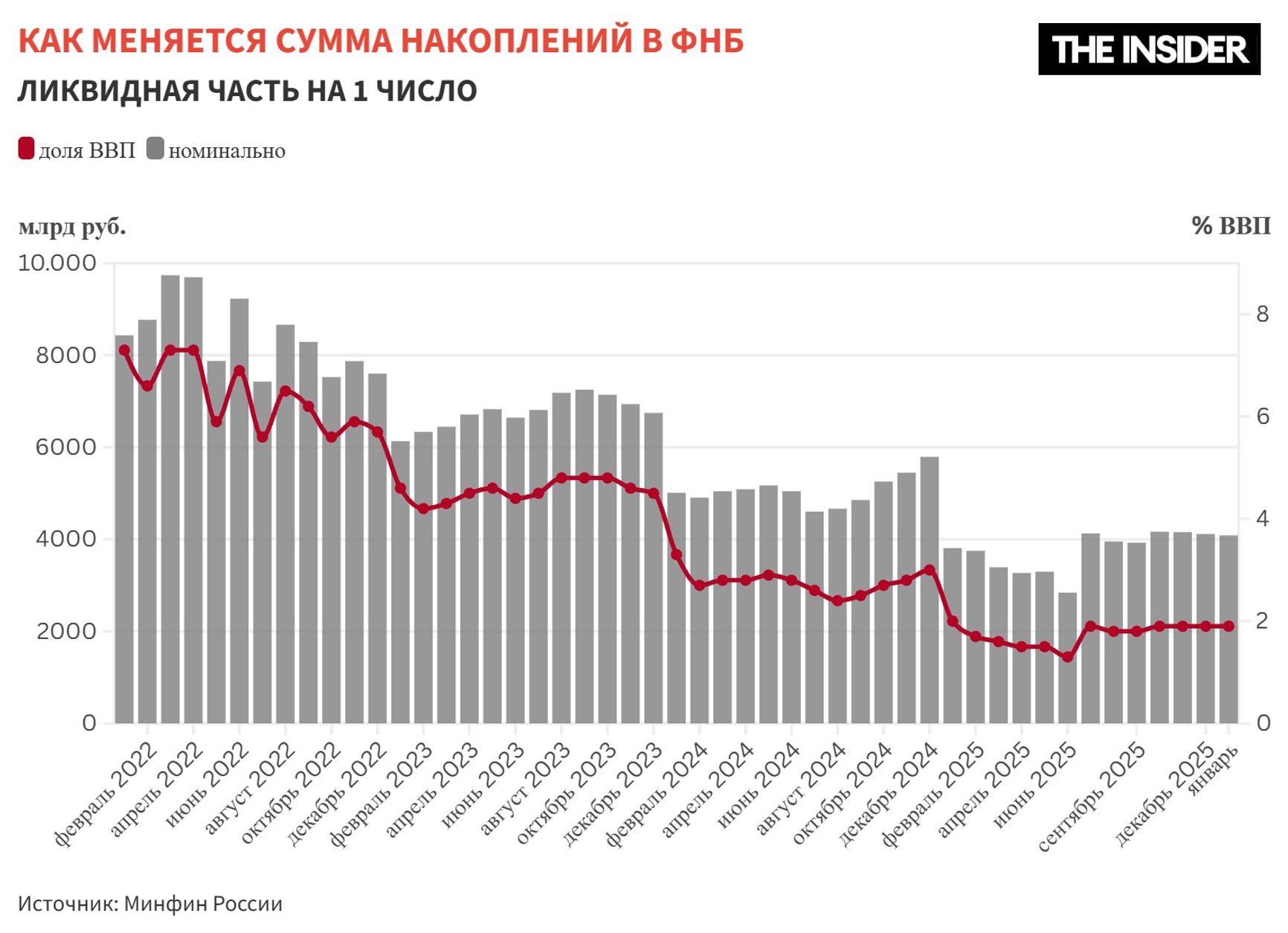 Когда цена нефти настолько ниже запланированной, правительство, чтобы покрыть дефицит бюджета, идет за деньгами в Фонд национального благосостояния (ФНБ). Это правило, закрепленное в законе. И оно уже начало работать: Минфин объявил, что в январе получит от нефти на 231 млрд рублей меньше, чем планировалось, и начал распродавать юани и золото из ФНБ рекордными темпами — по 12,8 млрд рублей в день, что больше, чем даже во время пандемии.