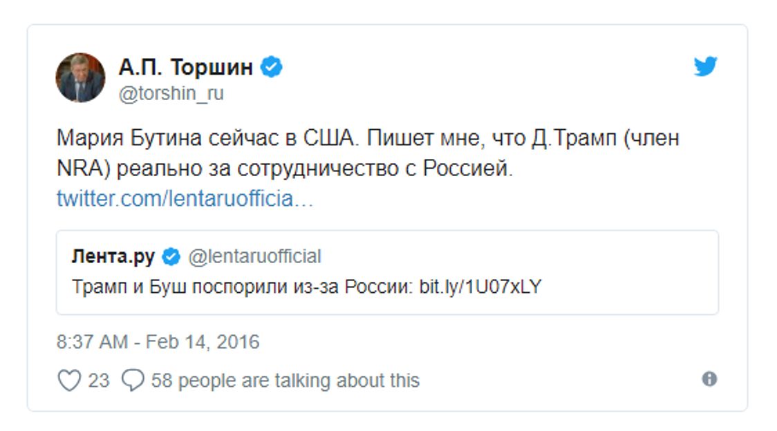 In February 2016, Butina and Erickson co-founded a company, Bridges, LLC. Erickson subsequently told the press that the company's purpose was to finance Butina's studies in America, but that did not sound plausible. Around that time, Torshin posted a Tweet: «Maria Butina is in the USA now. She writes that D. Trump (NRA member) is firmly in favor of cooperation with Russia.» (Comment on link to «Trump and Bush disagree on Russia.»)