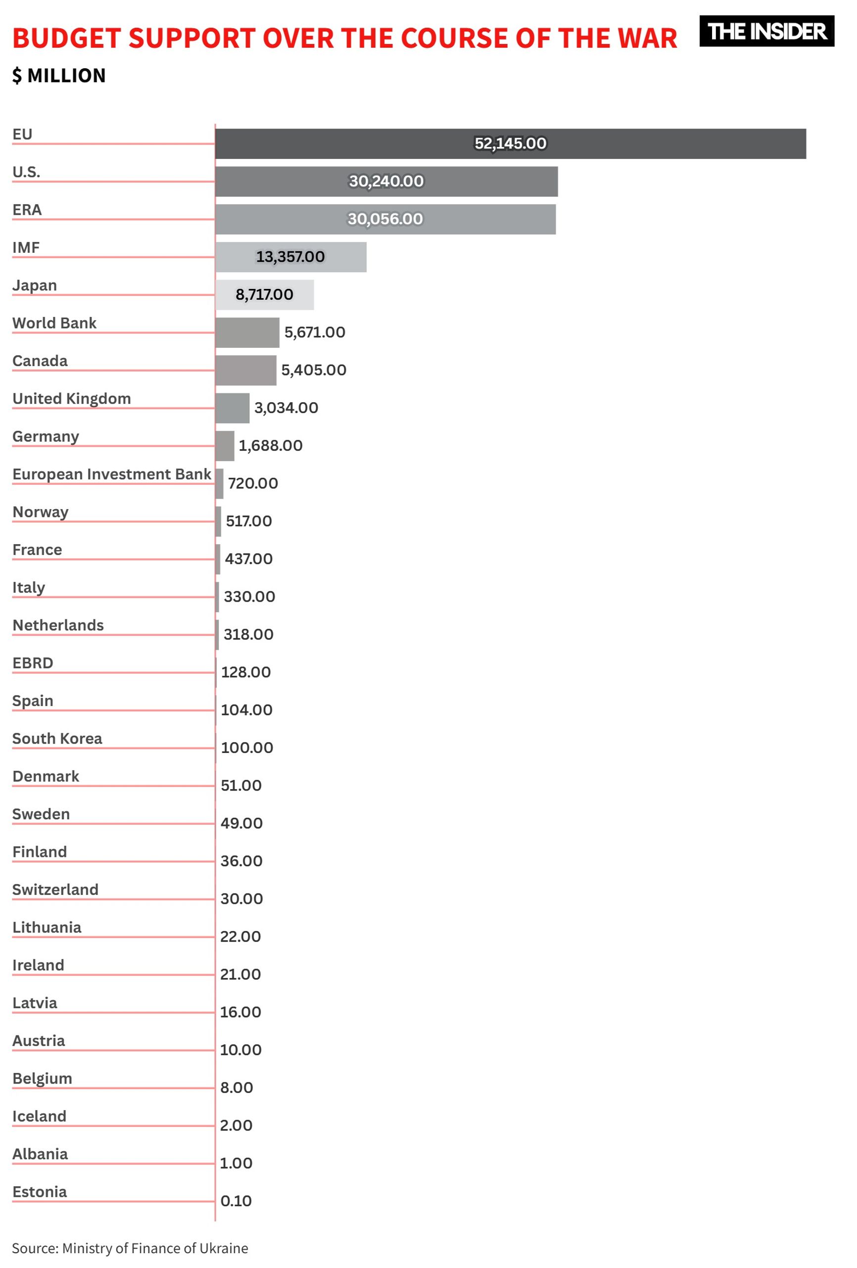 The main donor to Ukraine has been, and remains, the European Union. In 2024 the bloc provided the largest share of financial assistance under the Ukraine Facility for 2024–2027. Total support reached $17.3 billion, including $3.2 billion in grants.