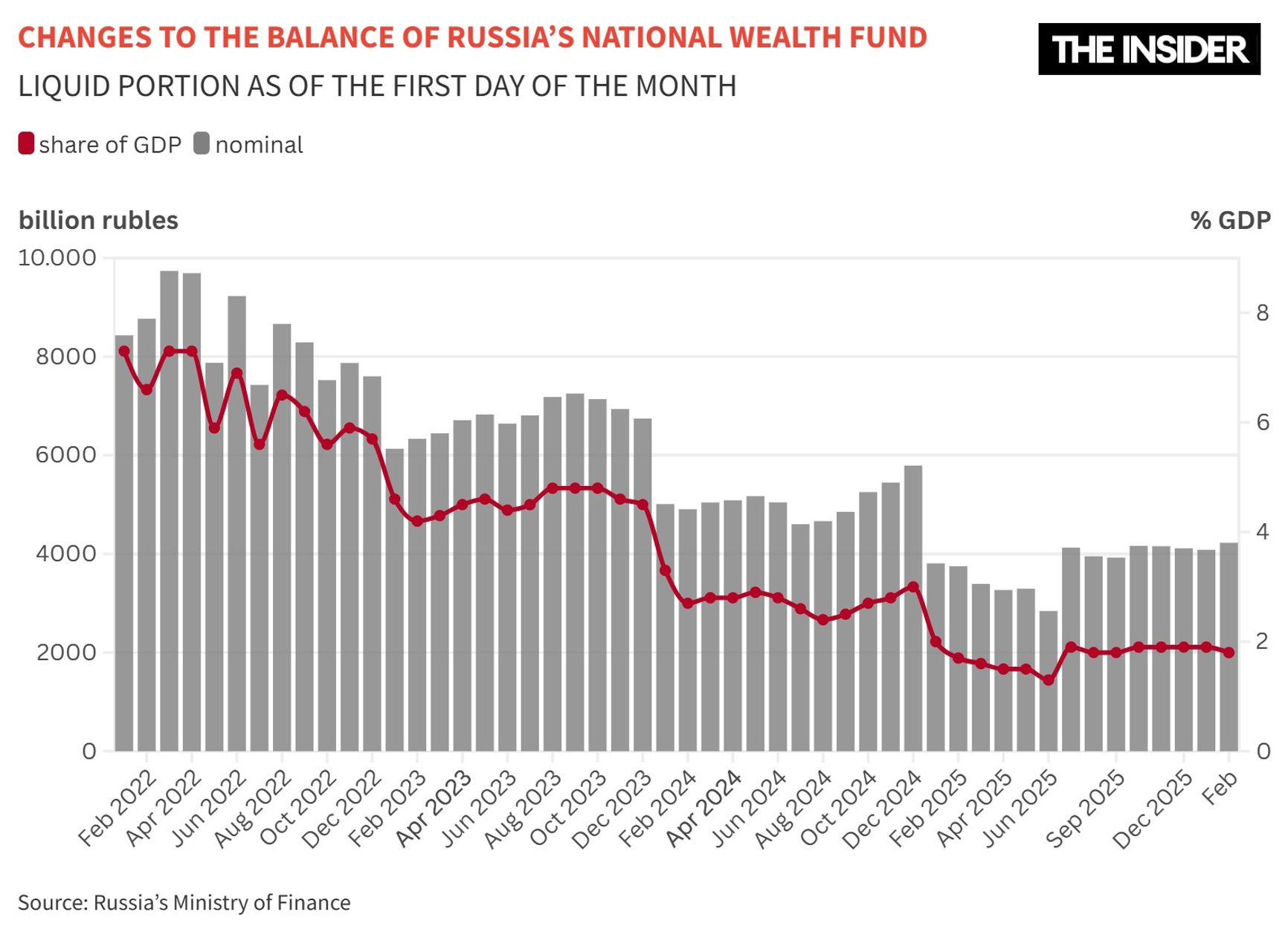 When oil prices fall significantly below budget assumptions, the government covers the shortfall using the National Wealth Fund (NWF), as required by law. That process has already begun. The Finance Ministry said January oil revenues would be 231 billion rubles below the plan and began selling yuan and gold from the fund at a record pace of 12.8 billion rubles a day, faster than during the pandemic.