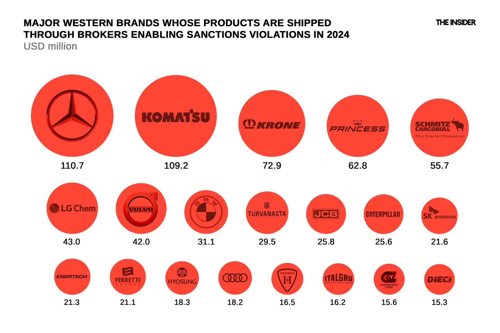 While the brokers handling the paperwork and the Russian buyers utilizing sanctioned goods remain difficult to track, the major Western corporations whose goods are processed by these brokers are publicly known. The most notable among them are shown in the infographic, matched with the amounts Russian buyers spent on their purchases of sanctioned products.