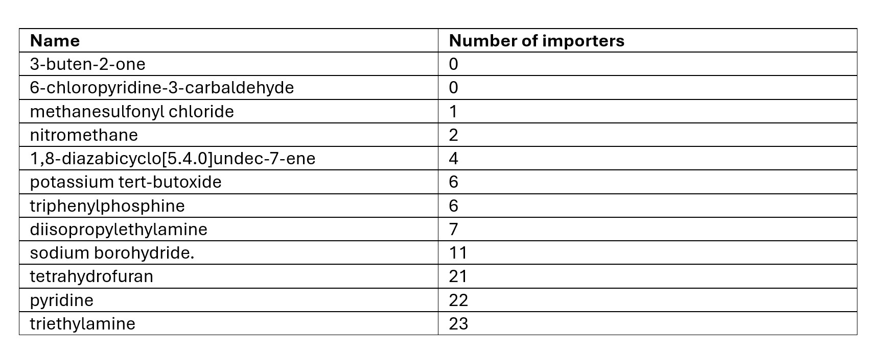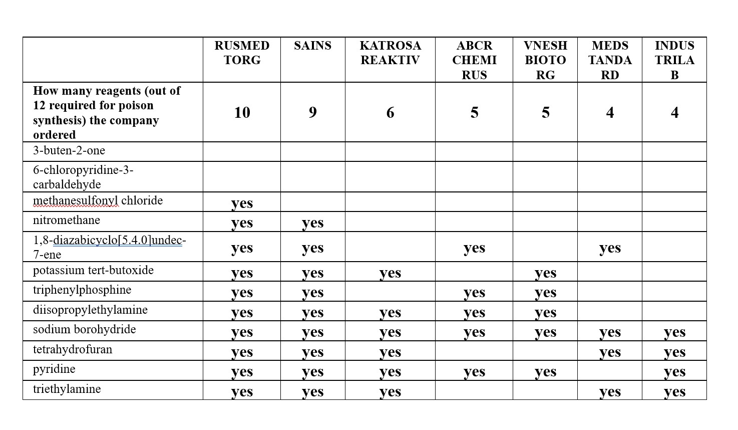 Of the 12 substances required for the synthesis according to the scheme described by Russian chemists in the above-referenced 2013 article, two were not imported into Russia by anyone. Of the remaining ten, some are very common while others are rare. The Insider selected those companies that imported at least four components — there were seven in total, but only four of them imported the key component for creating the bicyclic compound: 1,8-diazabicyclo[5.4.0]undec-7-ene.