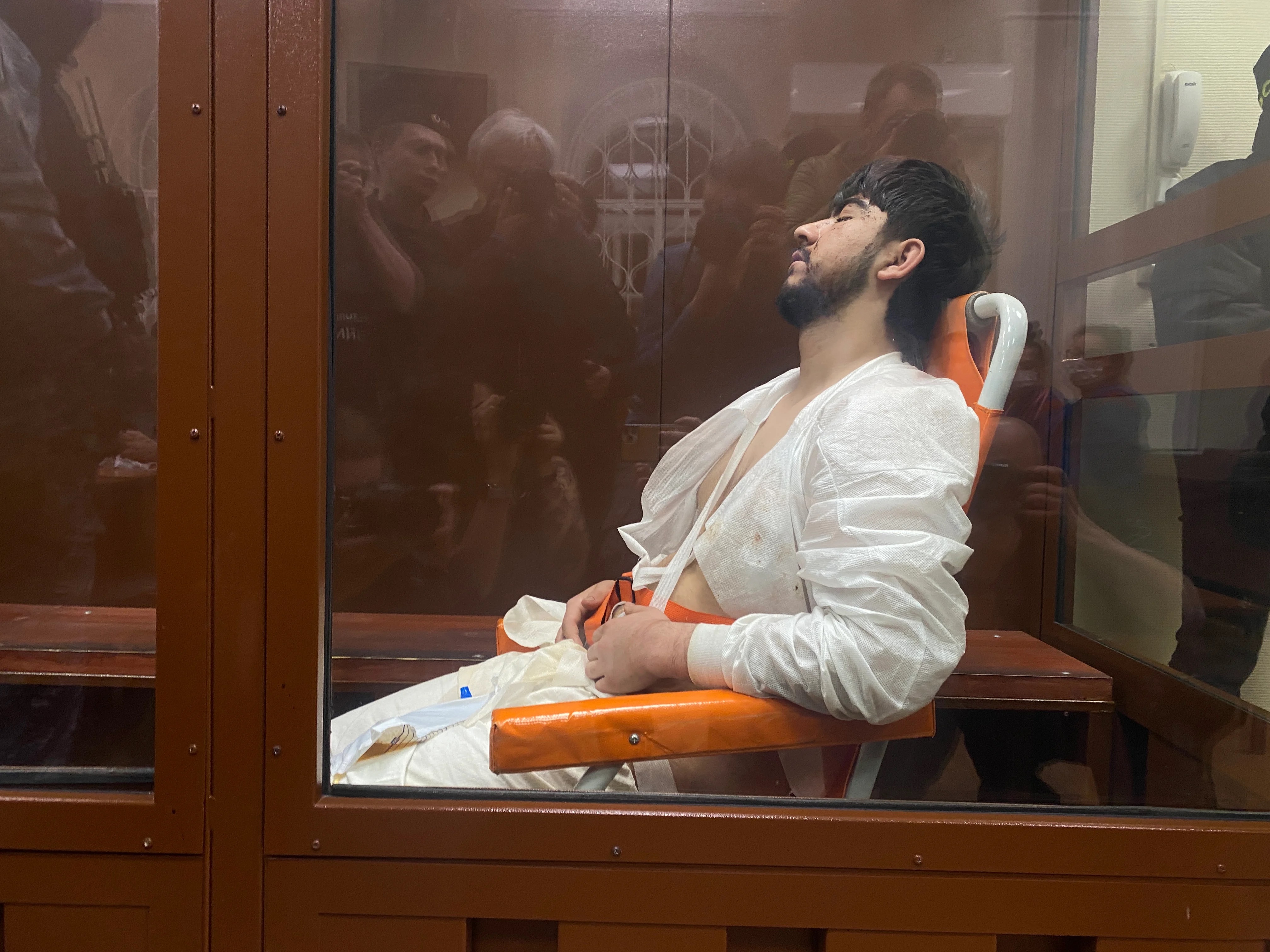 In court, Mirzoyev, Rachabalizoda and Fariduni showed signs of severe bruising, including swollen faces, while Faizov was brought to court from a hospital in a wheelchair and sat with his eyes closed throughout the proceedings. Medics attended to him in court, where he wore a hospital gown and trousers and had multiple cuts.