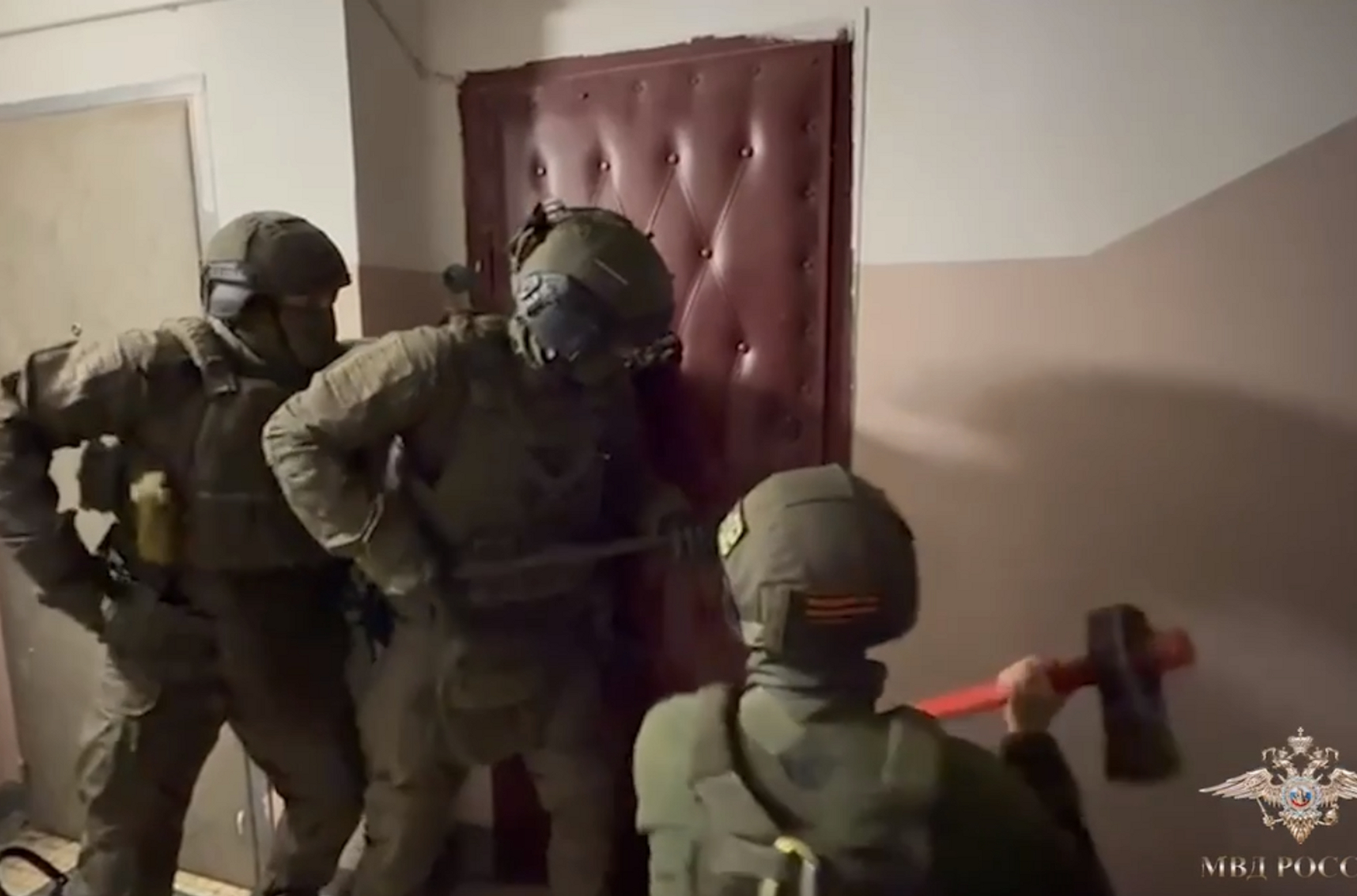 Raid on the apartment of a suspect accused of illegally sharing phone numbers with third parties. A still from a video by Russia's Ministry of Internal Affairs.