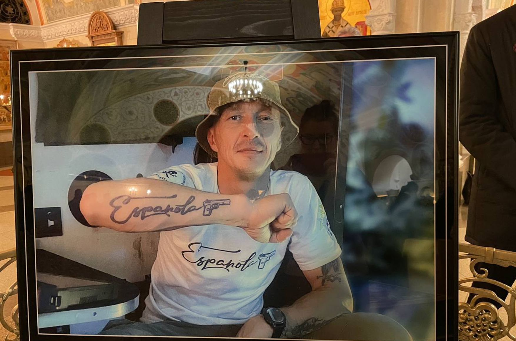 A photo of Stanislav Orlov diplayed at his funeral service, depicting him showing off his tattoo of Espanola's logo on his forearm. Photo: The Insider