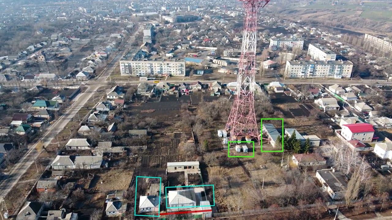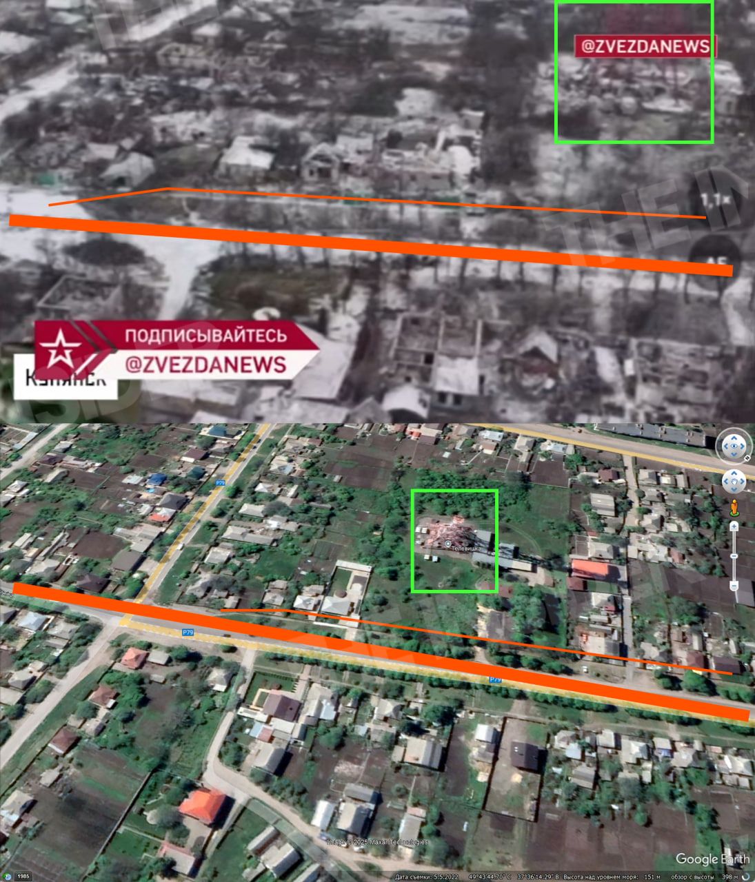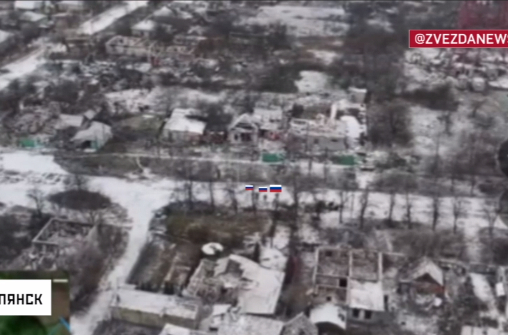 A YouTube video dated 2020, filmed by a drone in the same area, shows the same buildings that Russian troops pass in the Zvezda clip.