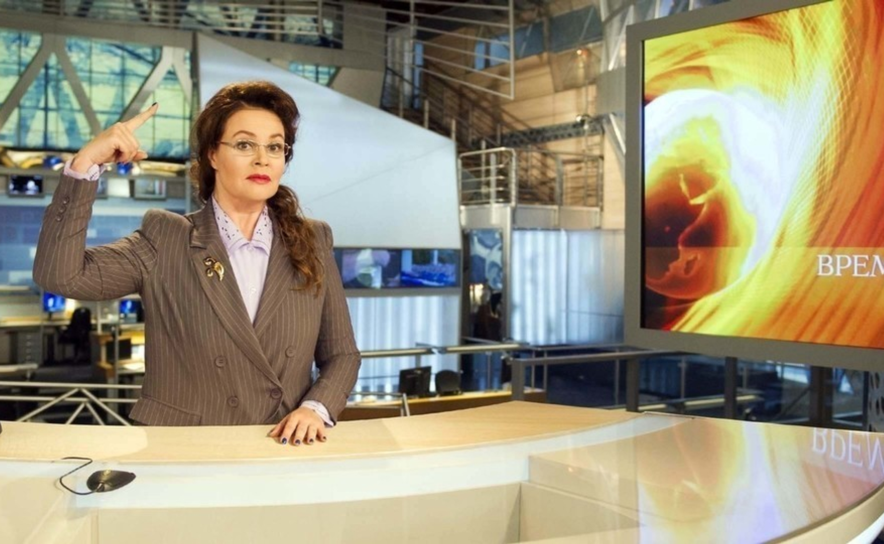 Ekaterina Andreeva, host of Channel One's Vremya, poses in Soviet-era clothing as part of the program's 50-year anniversary in 2017. Photo: Pervy Kanal (Channel One)