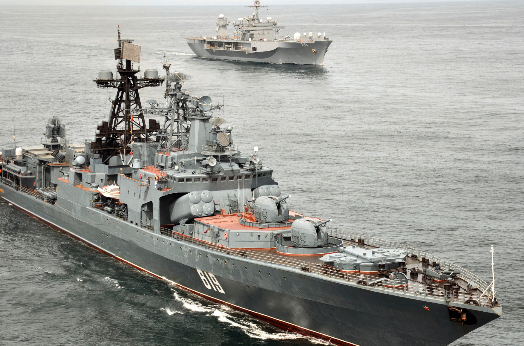 The Russian destroyer Severomorsk sails with the USS Mount Whitney (pictured in the rear) during joint exercises in July 2010. Photo: U.S. Navy