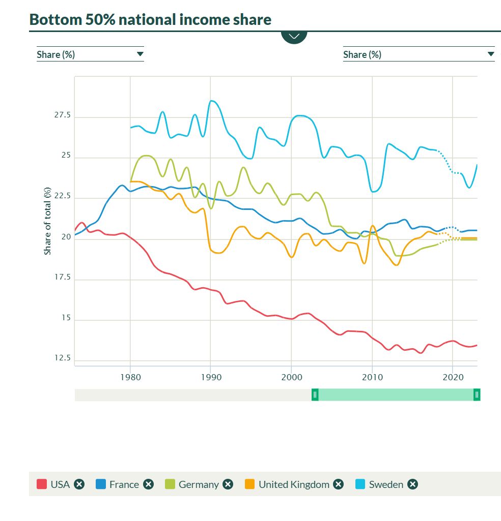While the U.S. is still doing reasonably well when it comes to the production of goods, it has faced major challenges with their distribution in the past two and a half decades. In Europe, the poorest 50% of the population receive a total of about 20% of the national income. This was also the case in the U.S. of the 1980s. Today, however, the poorest half of Americans receive only 13% of total income.