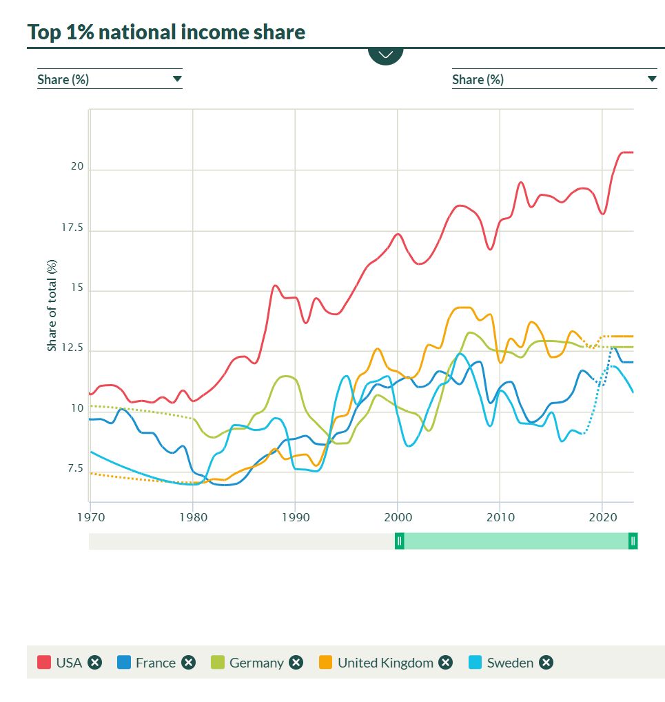 As for the richest 1% of citizens, in Europe they earn about 12% of total income, with the European community condemning this proportion as an indicator of strong inequality, compared to 8-9% half a century ago. In the U.S., they received a modest 10% of the total income in the 1970s and early 1980s, but today their share exceeds 20%. Since the mid-1990s, the richest 1% of Americans have been earning substantially more than the poorest 50% of U.S. citizens.