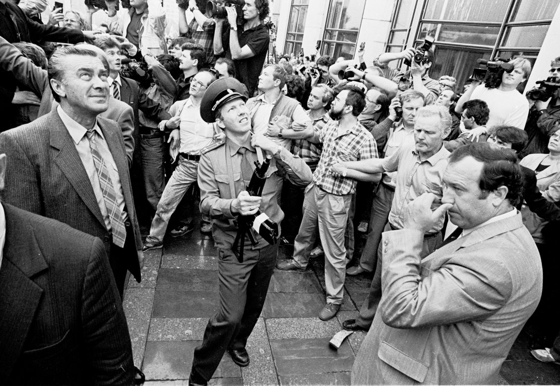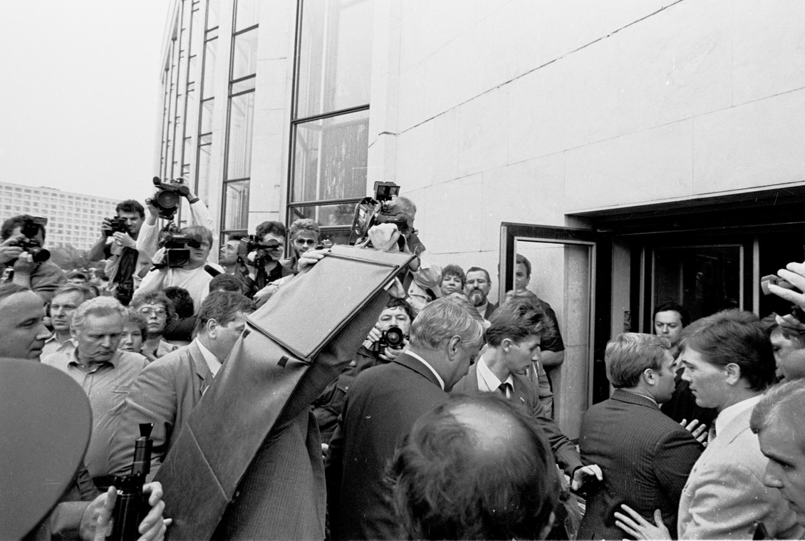 Здесь ближайший соратник Горбачева по перестройке Александр Яковлев (которому Горбачев предпочел общество будущих гэкачепистов) и ближайший соратник Бориса Ельцина Руслан Хасбулатов, который в 1993 году будет его главным противником. Александр Яковлев приехал в Белый дом, где пользуясь своим положением и связями мог помочь его защитникам. Я работал в «Огоньке» бок о бок со знаменитым фотокорреспондентом с 50-летним стажем Львом Николаевичем Шерстенниковым. Незадолго до путча Шерстенников снимал Яковлева и подружился с ним. Он приехал к Яковлеву домой на своих «Жигулях» и говорит: «Александр Николаевич, давайте я вас отвезу к себе на дачу, чтобы вас не арестовали, за мной-то не следят». Но Яковлев попросил его: «Лев, не надо ничего, я останусь в Москве. Буду координировать и помогать». Лев Николаевич попросил Яковлева оставить автограф на обшивке «Жигулей», и Яковлев написал фломастером: «Вот и настал час X. Бедная наша страна. Александр Яковлев». И 19 августа был в Белом доме.