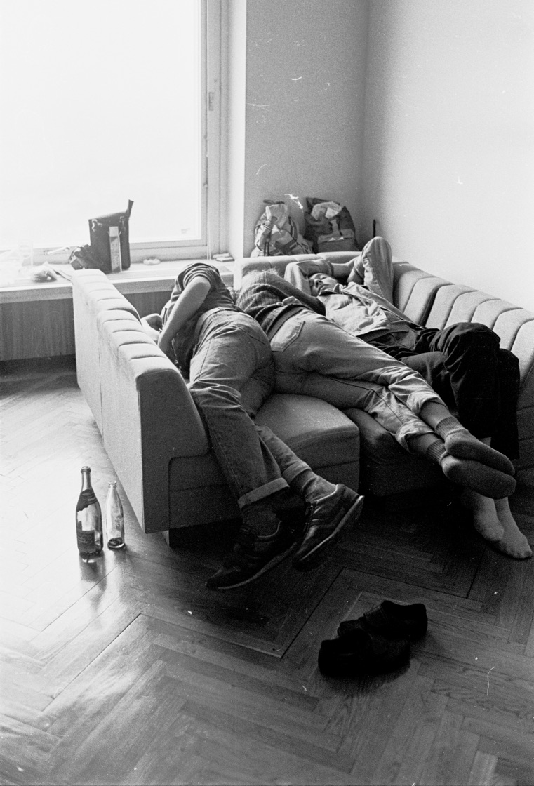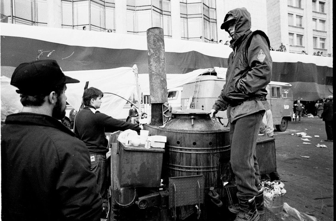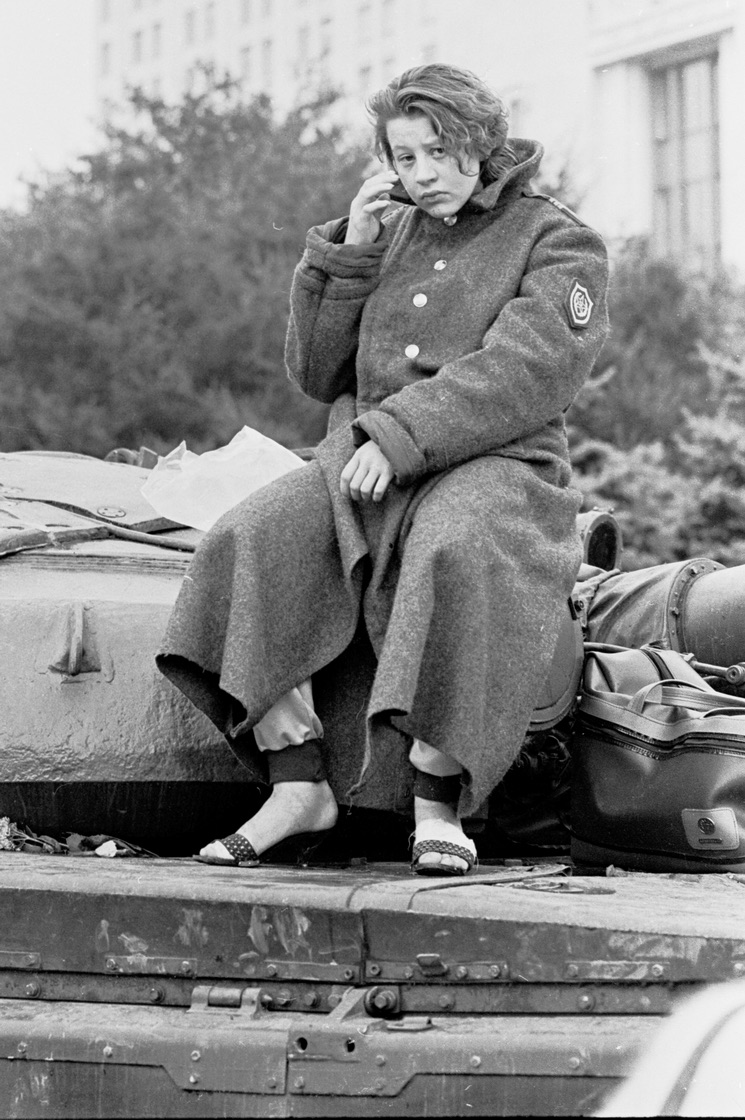 В этой серии снимков - защитники Белого Дома. Вот кто-то в очередной раз подозревает, что на крыше - снайперы. Вот наоборот вид с крыши - наши автоматчики высматривают передвижения противника. Молодые парни спят вповалку, наверное, это уже после возвращения Горбачева и победы. Многих тогда обидело, что Горбачев, прилетев из Фороса, не приехал к Белому дому, люди не знали, что Раиса Максимовна очень плохо себя чувствовала, и Горбачев сопровождал её домой. Еще один кадр - полевая кухня. Люди были около Белого дома круглосуточно, им нужно было дать хоть немного горячей еды. Кто привез эту полевую кухню, я не знаю. Еще одна сцена из Белого дома - видим, что беспорядок, конечно был. Блок сигарет, банка варенья, бумажные стаканы «Пепси». А вот солдаты дали девушке шинель - ночью был большой ливень, все промокли и замерзли.
