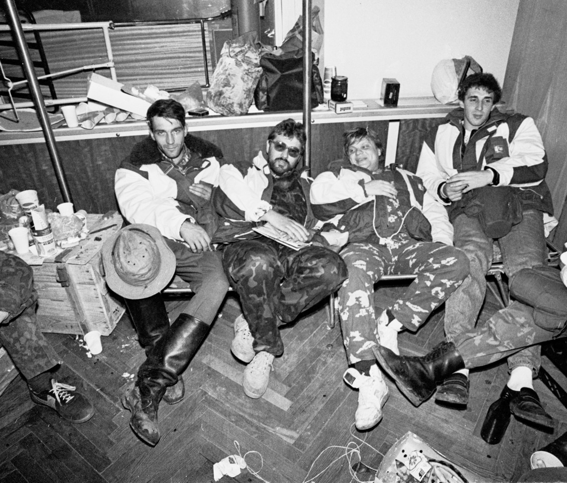 Знаменитый снимок, где Ростропович с автоматом, был сделан в радиоузле, в цоколе Белого дома, где было организовано вещание на площадь для защитников здания - днем выступающие выходили на балкон, но вечером и ночью выступали из этой рубки, потому что считалось, что на балконе небезопасно. Кроме самого известного кадра было сделано еще несколько. Вот, например, самый первый снимок, еще с порога радиоузла. Он был сделан в ночь с 21 на 22 августа, когда полетели за Горбачевым и ждали возвращения делегации, которую возглавляли Силаев, Руцкой и другие делегаты. Они уже возвращались Москву, а я ходил по Белому дому и зашел в эту радиорубку. На первом плане - Саша Политковский из «Взгляда», а сзади - Ростропович с охранником Юрой Ивановым, ждет очереди выступать. Он взял автомат просто покрутить в руках - он же не служил и никогда не держал в руках автомата. На коленях у Юры лежит первый номер «Общей газеты», потому что все средства массовой информации были запрещены указом ГКЧП - кроме «Правды», «Известий» и «Сельской жизни». И Егор Яковлев с журналистами стали издавать «Общую газету», первый номер которой как раз вышел 21 августа.