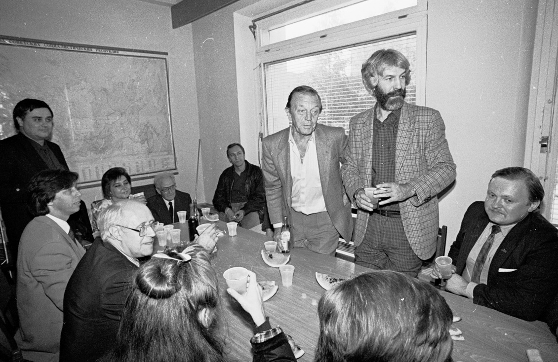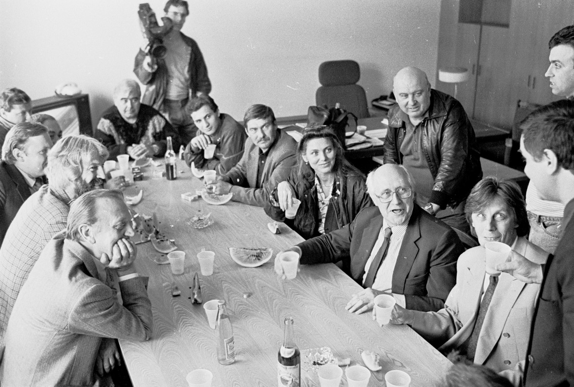 И, наконец, снова - Ростропович. И вот - победа! Два снимка с противоположных ракурсов. 24 августа зашли узким кругом в какой-то кабинет Белого дома отпраздновать победу. Водка, коньяк, закуски нет - только арбуз. Напротив Мстислава Леопольдовича - актер Анатолий Ромашин, он очень был дружен с Ростроповичем, который его звал «царь». «Царь, давай выпьем за победу!». По левую руку от него, если смотреть из-за стола, с бородой - актер Борис Хмельницкий, тоже друг Ростроповича. Слева от Ростроповича сидит Владимир Назаров, который в Олимпийской деревне был художественным руководителем концертного зала, а сейчас работает в Киеве, политический эмигрант и антипутинист. Концертный зал у него «отжали». А рядом с Хмельницким - тот самый охранник, Юра Иванов. Пожилой человек в углу - замечательный человек, муж сестры Ростроповича, Михаил Андреевич, переводчик. Ростропович ходил из Белого дома к своей младшей сестре Веронике поспать, помыться.