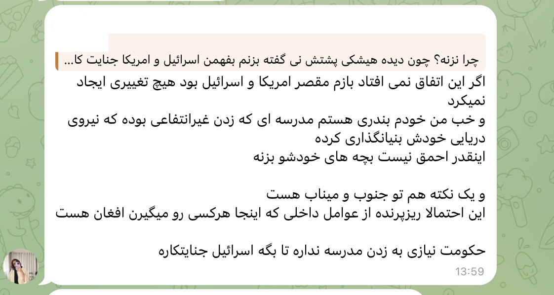 Местный житель 5 — студентка отделения акушерства в Бендер-Аббасе также признает связь школы с КСИР. Ее аккаунт зарегистрирован в июле 2024 года, состоит в 30 группах. В августе 2025 года она писала, что учится на бакалавриате в Бендер-Аббасе и не живет в общежитии. Она подтвердила тот же ключевой факт: школа была благотворительным учреждением, основанным ВМС КСИР. Ее пост — ответ на утверждение, что власти сами обстреляли школу: