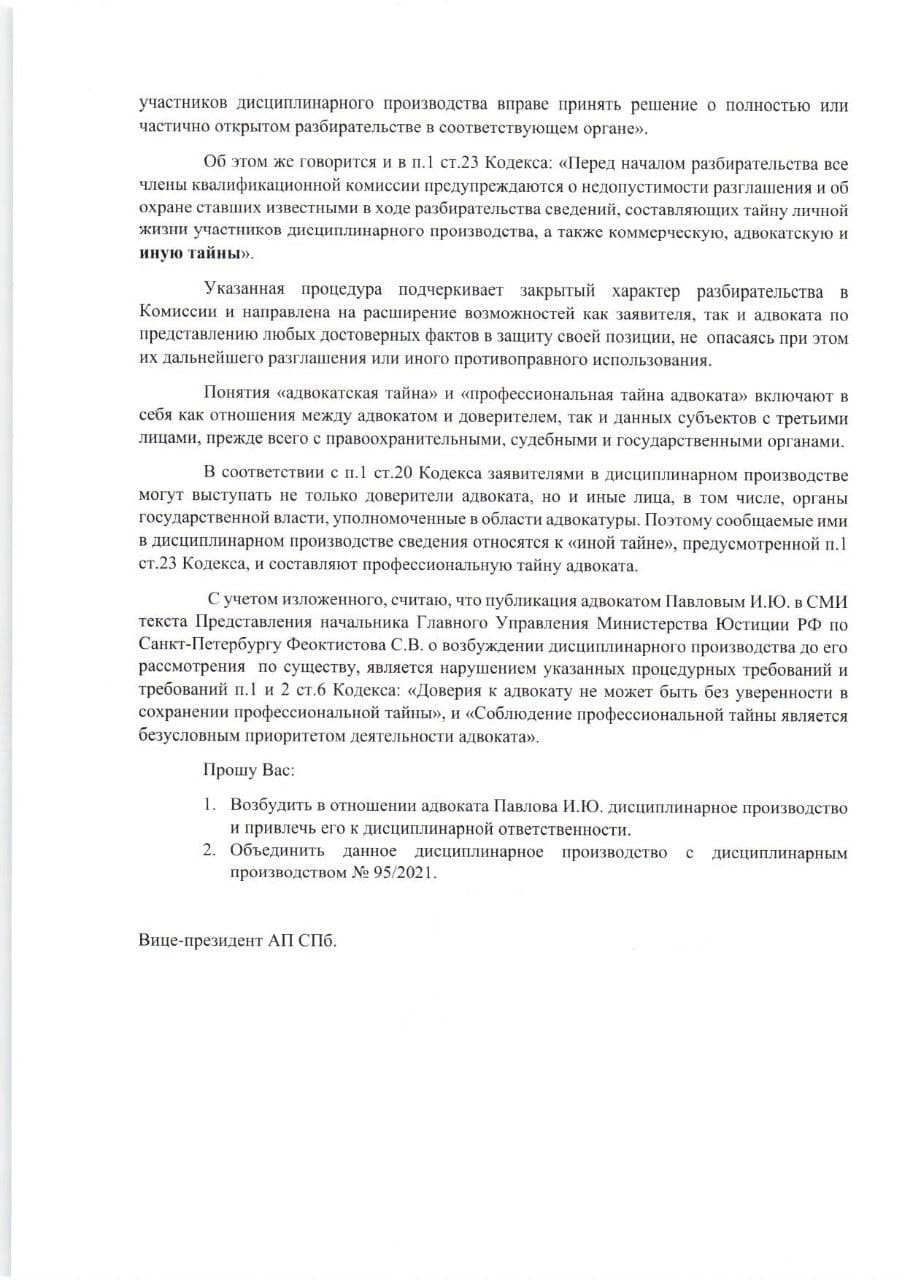 Один из вице-президентов Адвокатской палаты Санкт-Петербурга направил представление президенту палаты с просьбой привлечь к дисциплинарной ответственности адвоката Ивана Павлова. Автор жалобы посчитал, что Павлов нарушил Кодекс профессиональной этики адвоката, опубликовав в СМИ текст представления петербургского управления Минюста о возбуждении в его отношении дисциплинарного производства 21 декабря. Об этом Павлов сообщил в Telegram-канале.