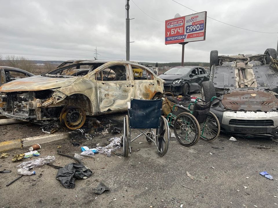 Фотограф Михаил Палинчак сообщил, что в 20 км от Киева обнаружили тела трех человек: мужчину и двух обнаженных женщин. По словам Палинчака, их хотели сжечь на обочине. По данным Минобороны Украины, найдено «4-5 трупов обнаженных женщин», которые «пытались сжечь российские варвары».
