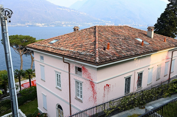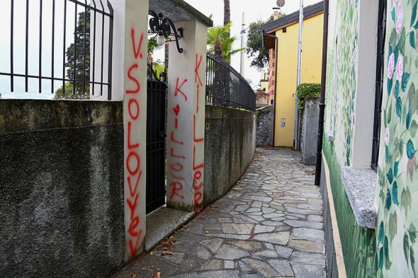 6 апреля стены виллы пропагандиста Владимира Соловьева на озере Комо в городе Пьянелло-дель-Ларио изрисовали, а в бассейн добавили красный краситель. Об этом рассказал телеканал Rai News. Над входной дверью на вилле Соловьева неизвестные написали слово «убийца».