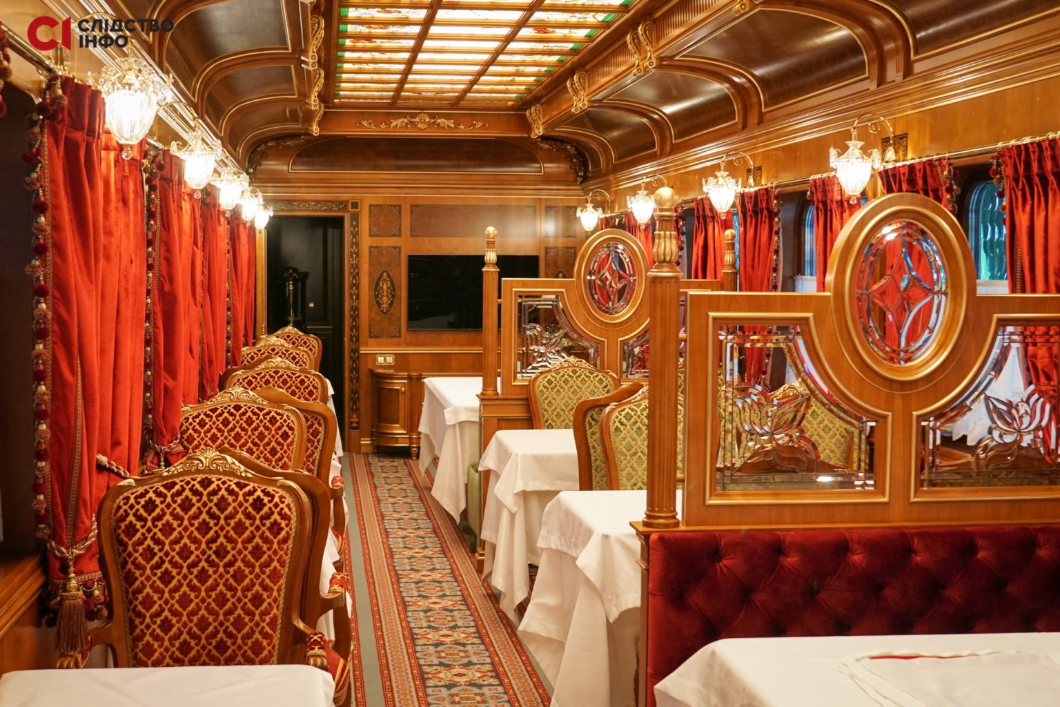 Журналисты «Следство.Инфо» нашли и показали вагон-ресторан еще в марте. В нем есть основной зал на 40 человек, кухня, вип-купе и туалет, барная стойка. Также в поезде были найдены стаканы с золоченым гербом России стоимостью 5 тысяч гривен за штуку. Кроме того, вагон Медведчука украшают настольная лампа французского бренда Bronze D'Art Français «Наполеон lll» за 100 тысяч гривен, позолоченный самовар, столовые наборы французского люксового бренда Cristofle Paris. Сундук для хранения серебряных вилок, ложек и ножей стоит 14 тысяч гривен, а каждая серебряная вилка и ложка — от 3 тысяч до 9 тысяч гривен.