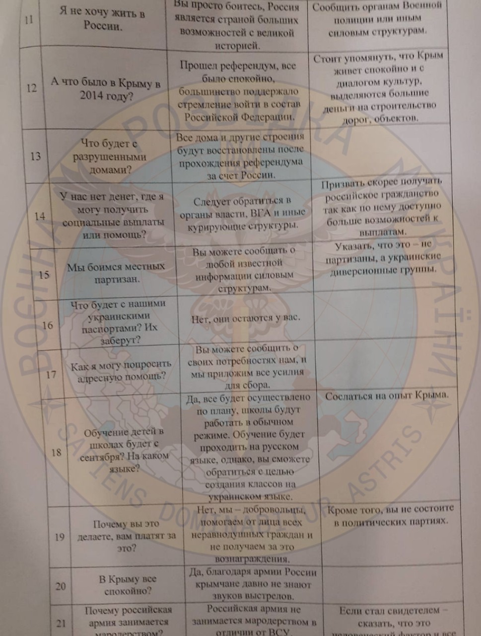 Основная часть документа — заготовленные ответы на частые вопросы мирных жителей. Например, на вопрос «Неужели Зеленский нас ненавидит?» нужно ответить: «Зеленский ничего не решает, все решают его кураторы из США». На вопрос о том, спокойно ли в Крыму, — «Да, благодаря армии России крымчане давно не знают звуков выстрелов».