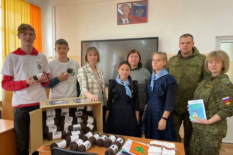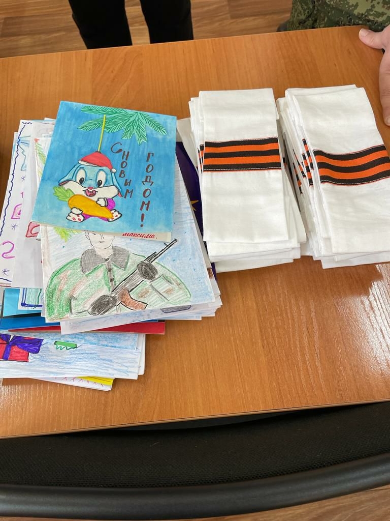 На этой встрече детям рассказали, что «участники спецоперации бережно хранят весточки из дома и клеят детские рисунки на боевые машины, отправляясь на спецзадания, а балаклавы и снуды в морозы как нельзя актуальны».