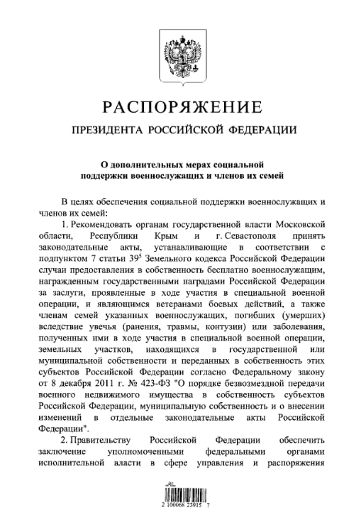 Президент России Владимир Путин издал распоряжение, согласно которому отличившимся участникам СВО рекомендуется безвозмездно выдавать земельные участки в Подмосковье, Крыму и Севастополе. Распоряжение опубликовано на официальном портале правовой информации.