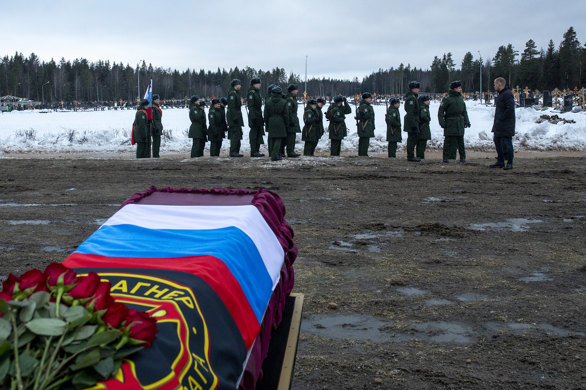 На кладбище приехал основатель ЧВК Вагнера, «повар» Путина Евгений Пригожин. Он появился за два часа до церемонии, поговорил с журналистами государственных СМИ и с сотрудниками РИА «ФАН», издания, которое связывают с самим Пригожиным. После общения с собравшимися основатель ЧВК Вагнера покинул кладбище, не дожидаясь погребения.
