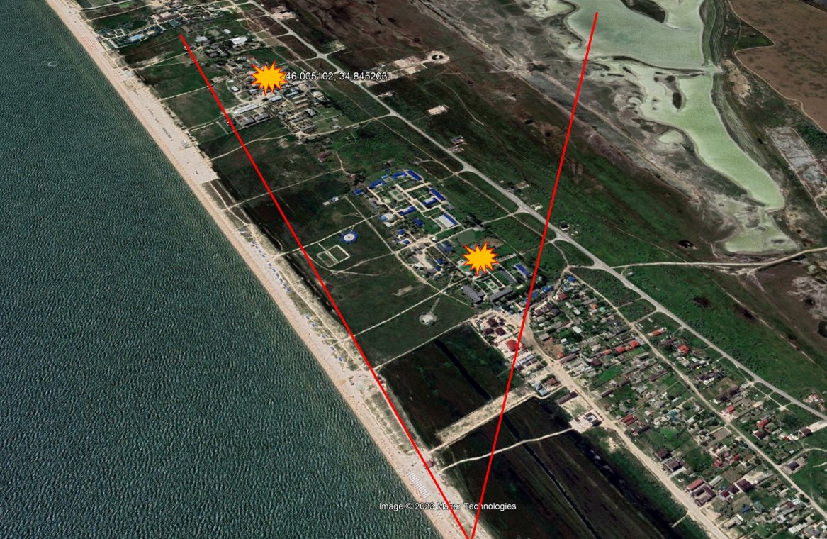 Зафиксированы прилеты по позициям российских военных близ Геническа, которые находятся в 130 км от линии фронта. Российские пропагандистские СМИ пишут об ударе ракетами Storm Shadow якобы по детской базе отдыха на Арабатской стрелке. С другой стороны, сообщается о поражении штаба российских войск в поселке Счастливцево Херсонской области, который находится как раз практически на Арабатской стрелке. В апреле 2023 года в нем побывал Владимир Путин. Позднее удалось установить, что штаб действительно был расположен на территории базы отдыха для детей.