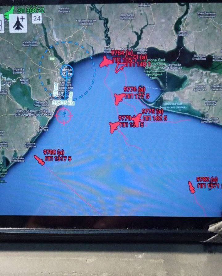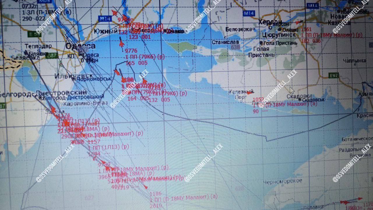 В Telegram-канале Moscow calling опубликованы, как заявляется, изображения налета на Одессу с экрана украинской автоматизированной системы управления «Вираж-Планшет», которая позволяет отслеживать воздушные цели (некоторые из них взяты отсюда).