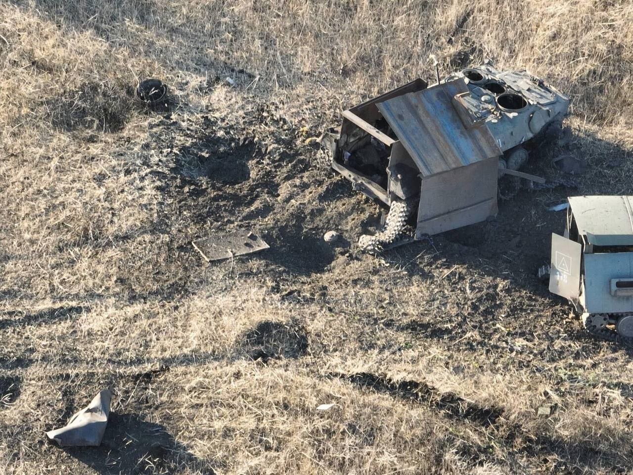 На снятых с разведывательного дрона кадрах можно увидеть модернизированные для перевозки пехоты советские гусеничные тягачи, которые были утрачены россиянами при подрыве на противотанковых минах в ходе недавних наступательных действий в районе Новомихайловки. Воронки от их детонации различимы позади машин на фото.
