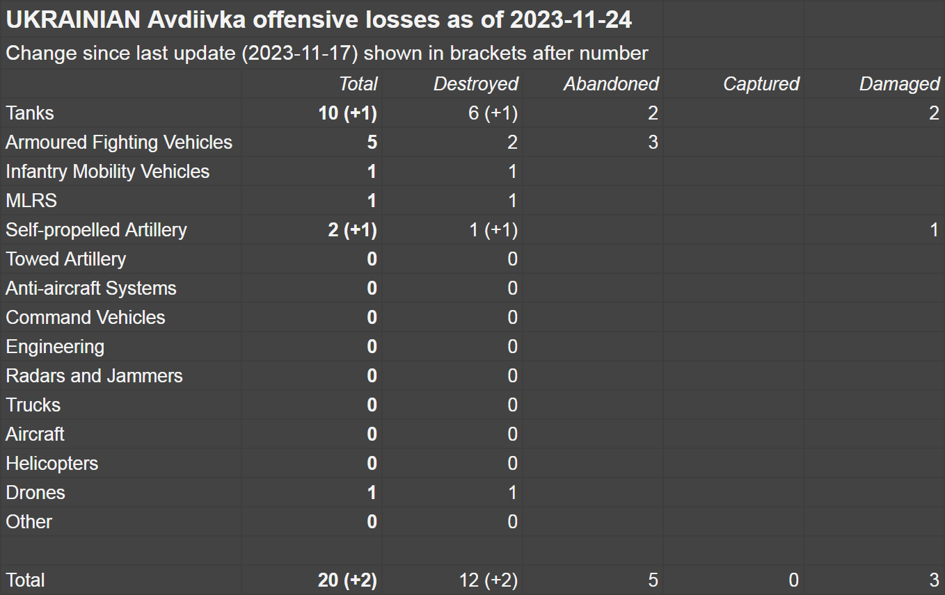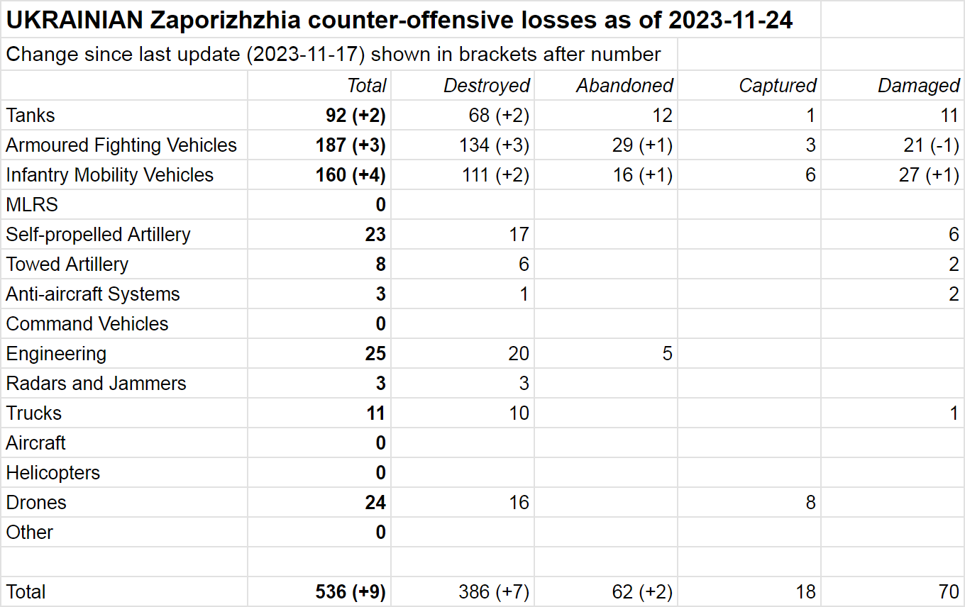 По данным аналитика под ником Naalsio, к 24 ноября подтвержденные потери ВС РФ на запорожском направлении составили 629 единиц военной техники, тогда как ВСУ — 536 единиц. За неделю ВСУ потеряли не менее 9 единиц техники (в том числе два танка и 3 ББМ), тогда как ВС РФ — 18 (включая два танка и 12 ББМ).