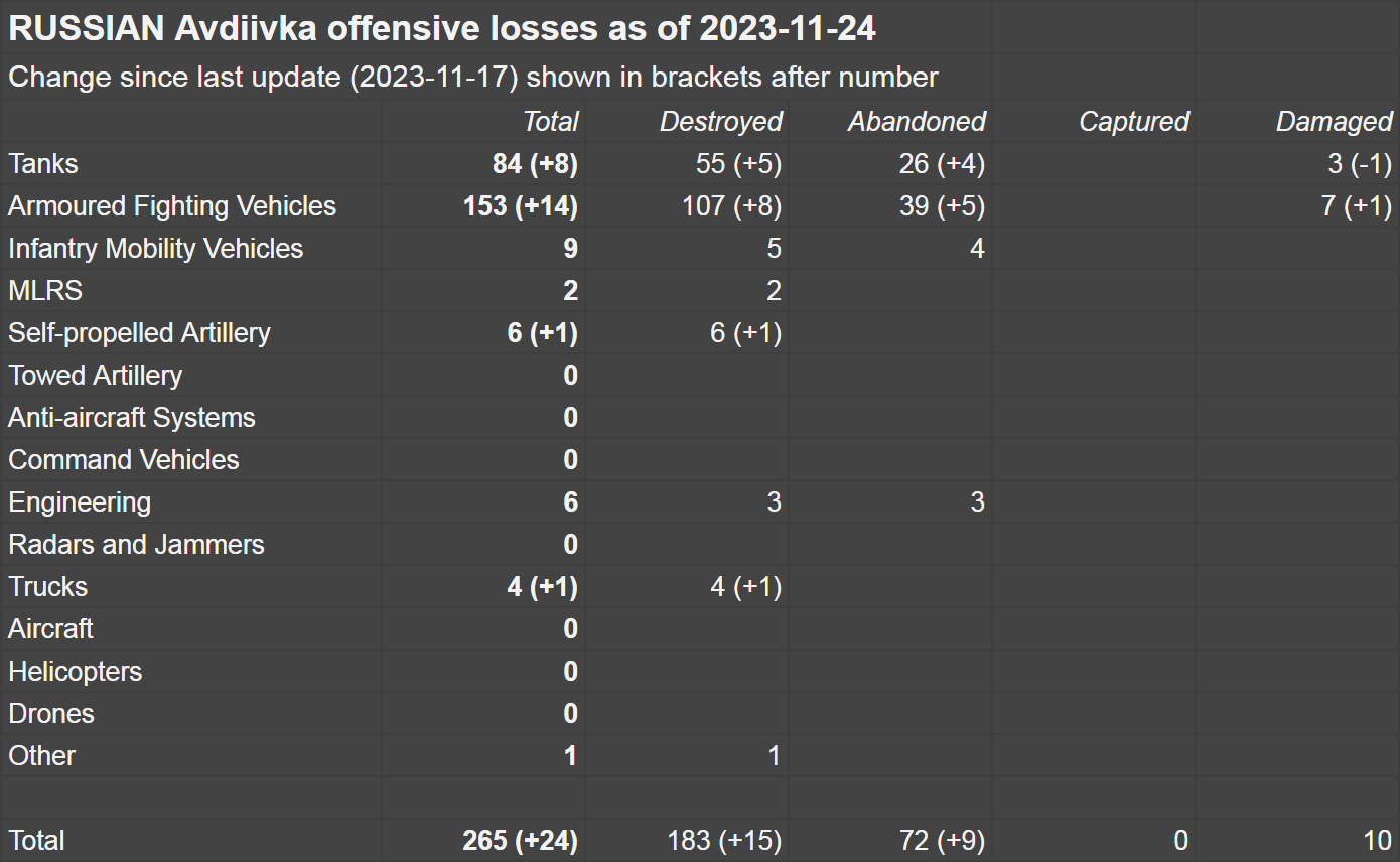 Под Авдеевкой, по подсчетам Naalsio, россияне потеряли не менее 265 единиц техники (из них за последнюю неделю — 24, в том числе 8 танков и 14 ББМ), а украинцы только 20 (подтвержденные потери ВСУ за последнюю неделю составили один танк и одну САУ).