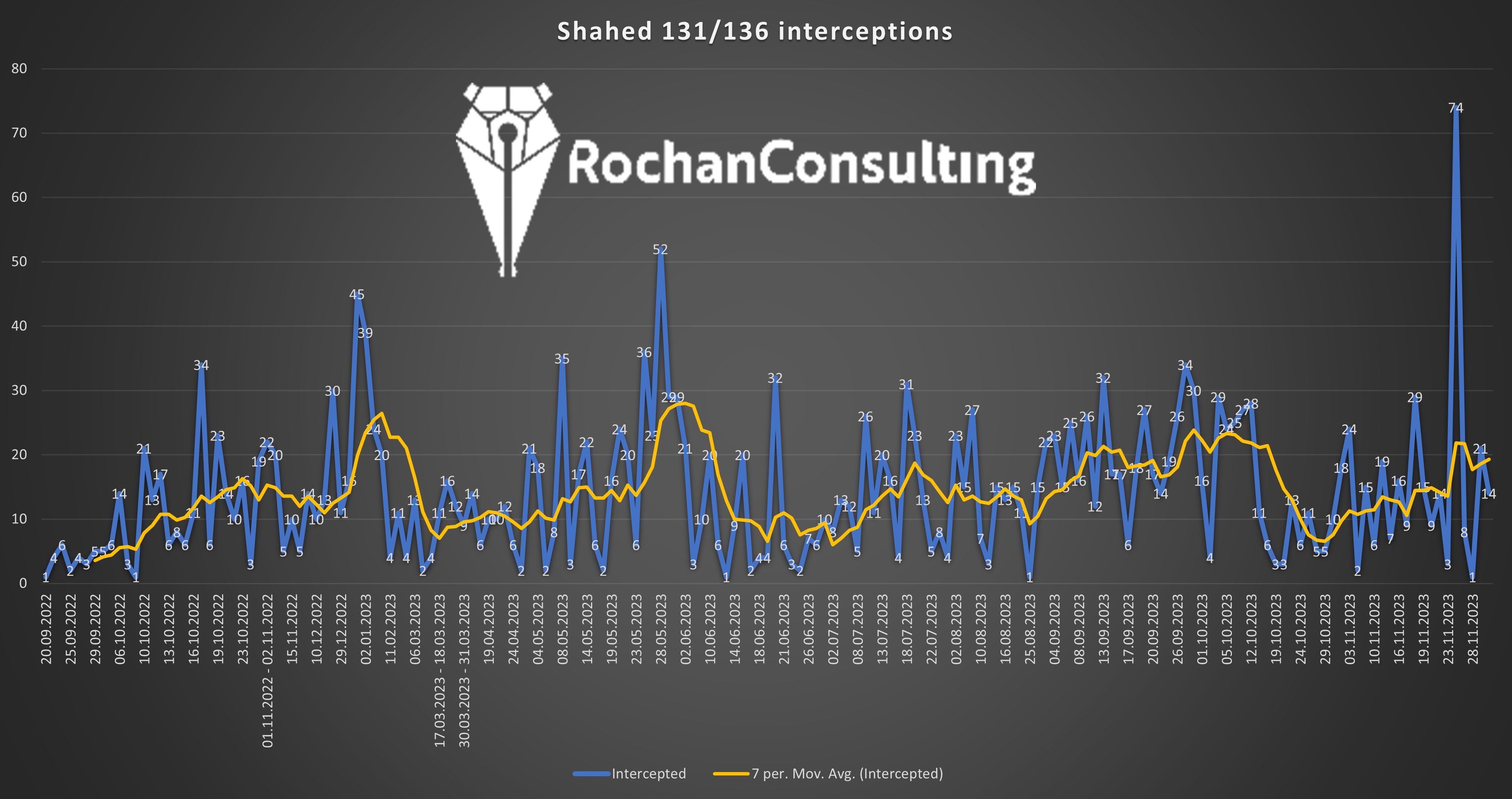 Военный эксперт Конрад Музыка публикует график количества «Шахедов», задействованных в налетах, и приходит к выводу, что самая массированная атака дронами в ночь на 25 ноября оказалась исключением, а не новой тенденцией, и без учета этого налета общий темп применения «Шахедов» кажется довольно низким. Также он предполагает, что налет 25 ноября мог быть своего рода «напоминанием» от Минобороны РФ в годовщину Голодомора.