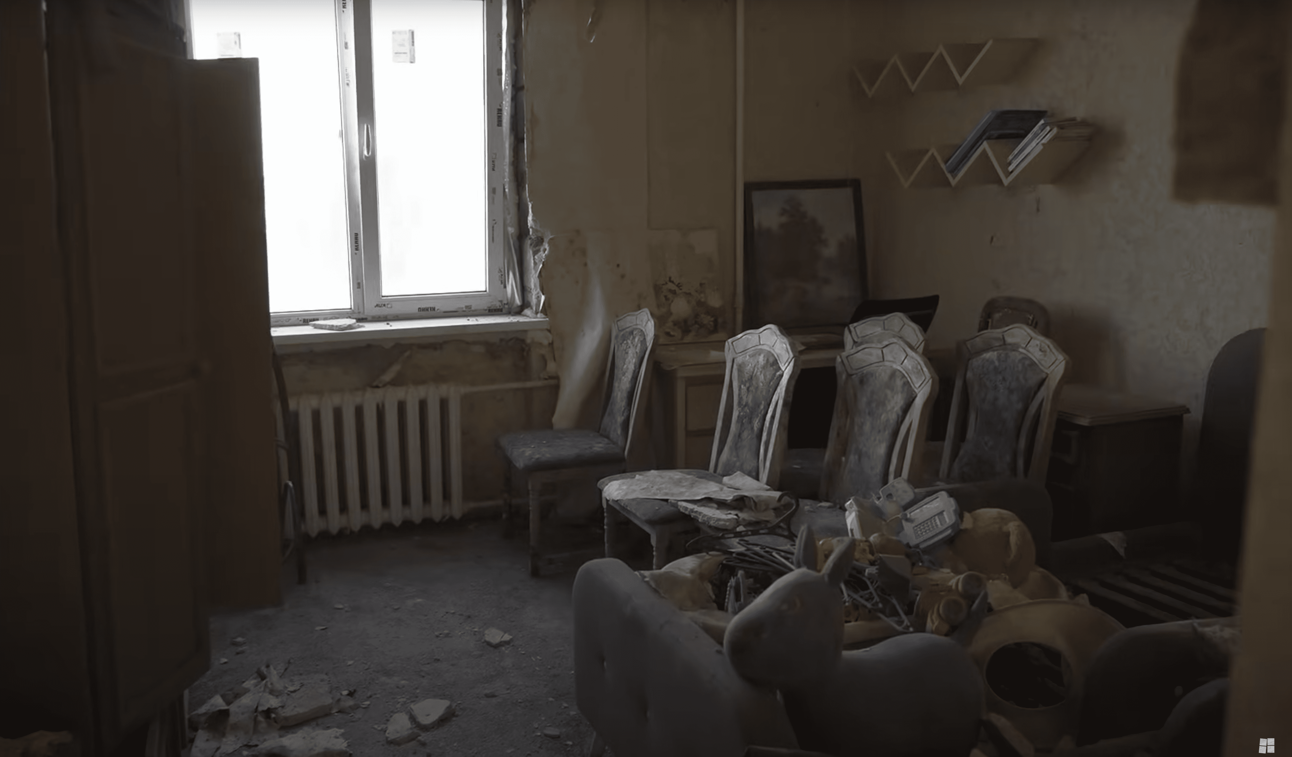 В ролике Мирошниченко показывает большую полуразрушенную квартиру. Видно, что все окна в ней были выбиты, вместо них стоят стеклопакеты с заводскими наклейками, вместо дверных проемов — дыры. Квартира заставлена мебелью и вещами тех, кто здесь жил: на кухне стоит посуда, техника, детский стульчик для кормления, детские игрушки, постельное белье, подушки. На полу лежат груды мусора, куски обоев. На столе в кухне осталась стоять бутылка из-под коктейльного апероля. Квартира стоит 5 млн рублей, рассказывает Мирошниченко. Все документы, по ее словам, «в порядке, проходят перерегистрацию в Росреестре с украинских документов на российские, после этого мы смело можем выходить на сделку в любом МФЦ». По словам риелтора, из квартиры не вымели мусор даже минимально, так как жильцы «покидали жилье в спешке, и у них нет сил вернуться убирать».