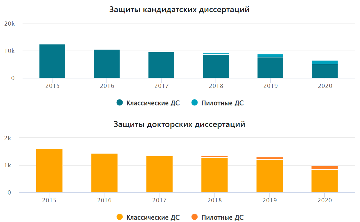 Согласно статистике за последние 30 лет, наибольшее количество кандидатских и докторских степеней в России было присвоено в середине 2000-х годов. Пик пришелся на 2006 год: тогда диссертации защитили 34613 человек (30650 — кандидатские и 3963 — докторские).