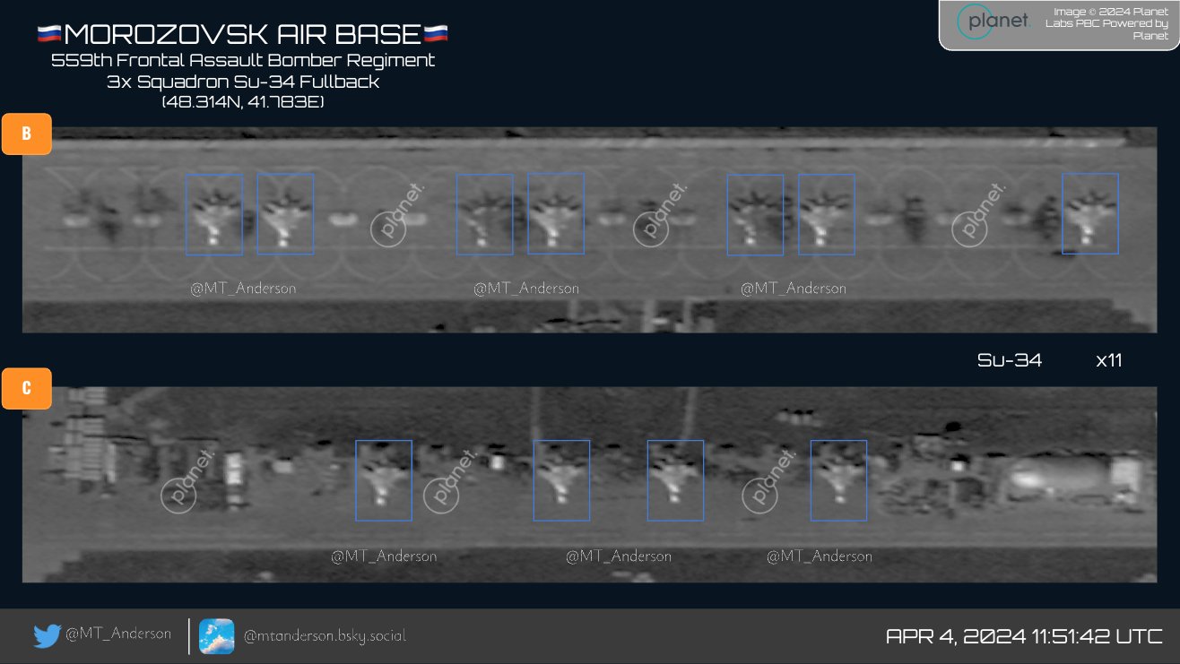 Исследователь MT_Anderson опубликовал спутниковые снимки аэродрома Морозовск, сделанные накануне обстрела. На них он насчитал 26 самолетов Су-34 и три Су-30/Су-35.