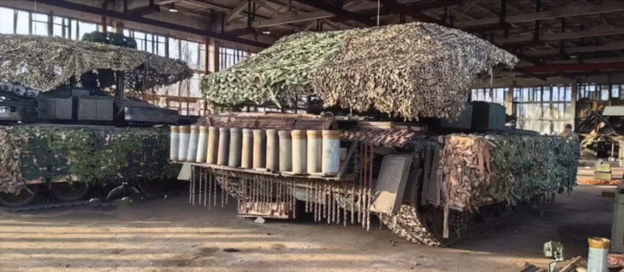 Украинский военный эксперт Андрей Тарасенко иронизирует над применяемыми в ВС РФ решениям в области защиты танков, в том числе размещением в качестве дополнительной брони бетонных блоков, металлических листов, деревянных ящиков и снарядных гильз.