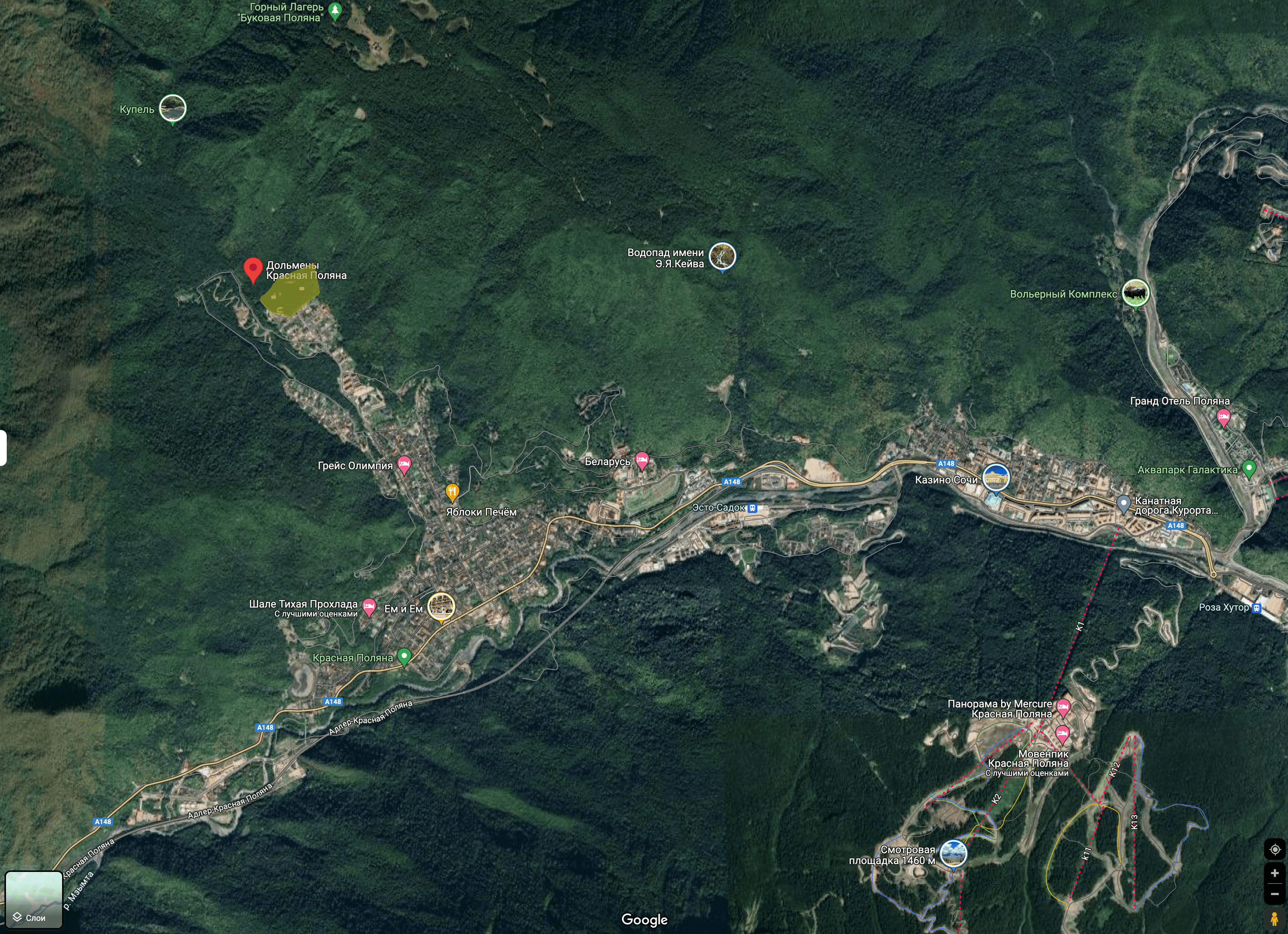 Земля находится в горах бок о бок с загадочными дольменами Красной Поляны — каменными сооружениями, построенными кельтами ориентировочно в III–II веке до нашей эры. Сейчас дольмены — место поклонения духам леса, гор, древним силам — популярны у эзотериков. Сюда приходят дикие кабанчики, а также йоги — на медитацию, «получают заряд бодрости друиды», сообщают туроператоры.