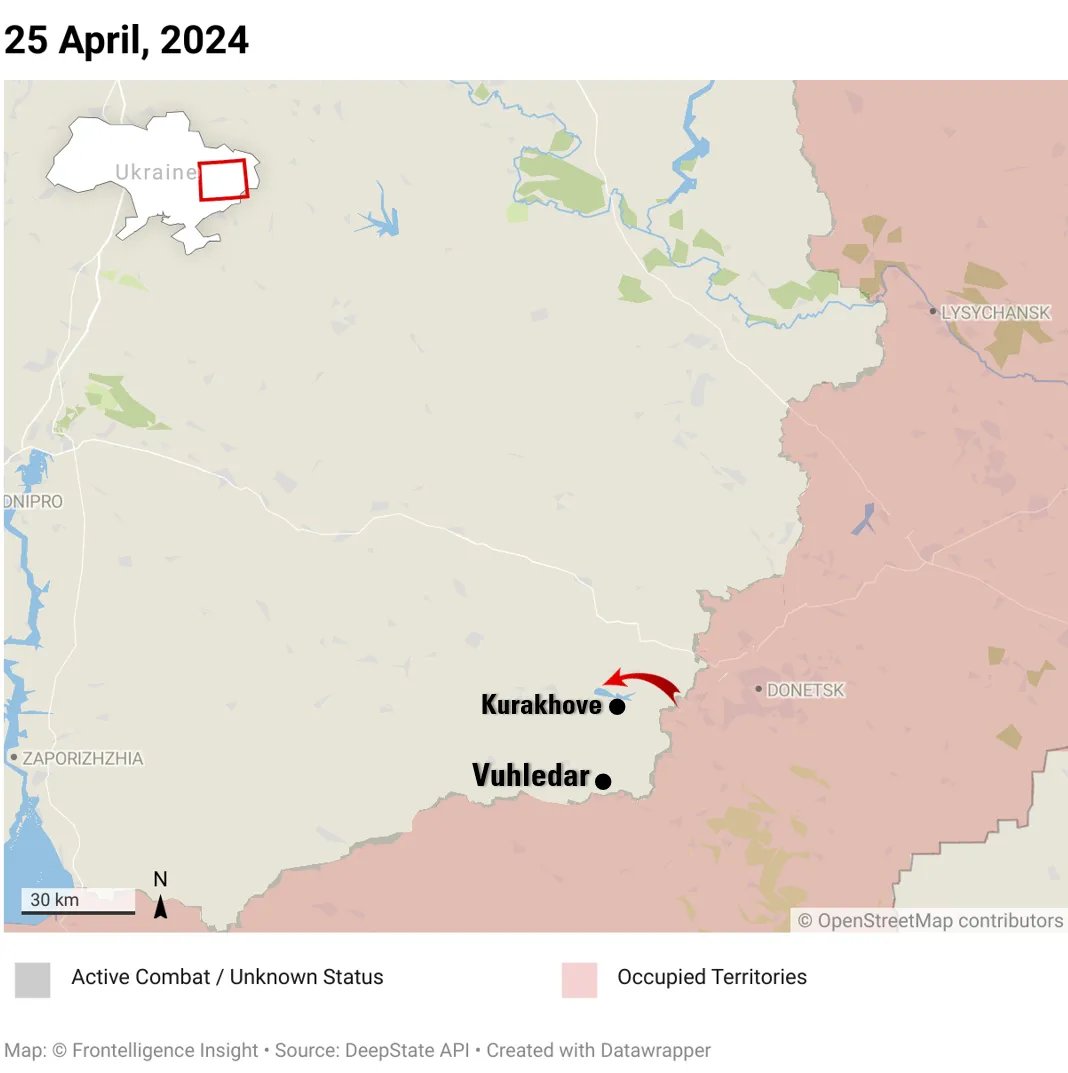 Исследователь Naalsio обновил данные по визуально подтвержденным потерям техники в Покровском районе (имеется в виду операционный район к западу от Авдеевки) и в районе Крынок на левом берегу Днепра. В Покровском районе, по его подсчетам, россияне за неделю с 19 по 26 апреля потеряли как минимум 25 единиц техники (в том числе 10 танков и 13 ББМ), подтвержденные потери техники ВСУ увеличились на 1 единицу. Под Крынками же подтвержденные потери сторон за тот же период составили 2 единицы техники для ВС РФ и одну — для ВСУ.