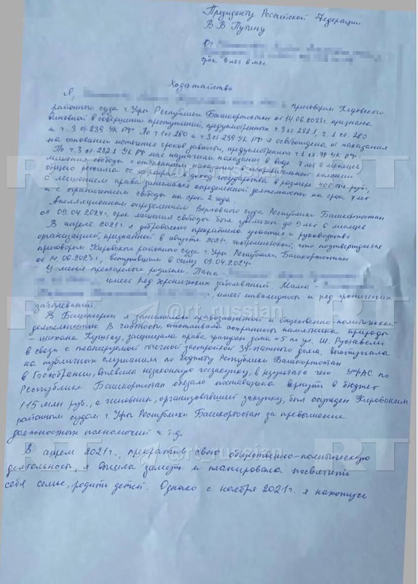 «Я подтверждаю факт написания. Мы это [с ней] обсуждали, его должны были отправить из уфимского СИЗО. Почерк в прошении Лилии», — сказал Гизатуллин в разговоре с RTVI.