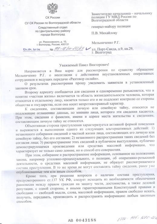 Следственный комитет не нашел состава уголовного преступления в действиях ведущих передачи «Разговор онлайн» на телеканале «Волгоград 1» Сергея Мазанова и его гостя экс-депутата Романа Потоловского, которые раскрыли личные данные людей, почтивших память погибшего Алексея Навального. В ответе юристу и жителю Волгограда Роману Мельниченко СК указал, что «фамилия, имя и адрес места жительства к сведениям, составляющим личную тайну, не относится».