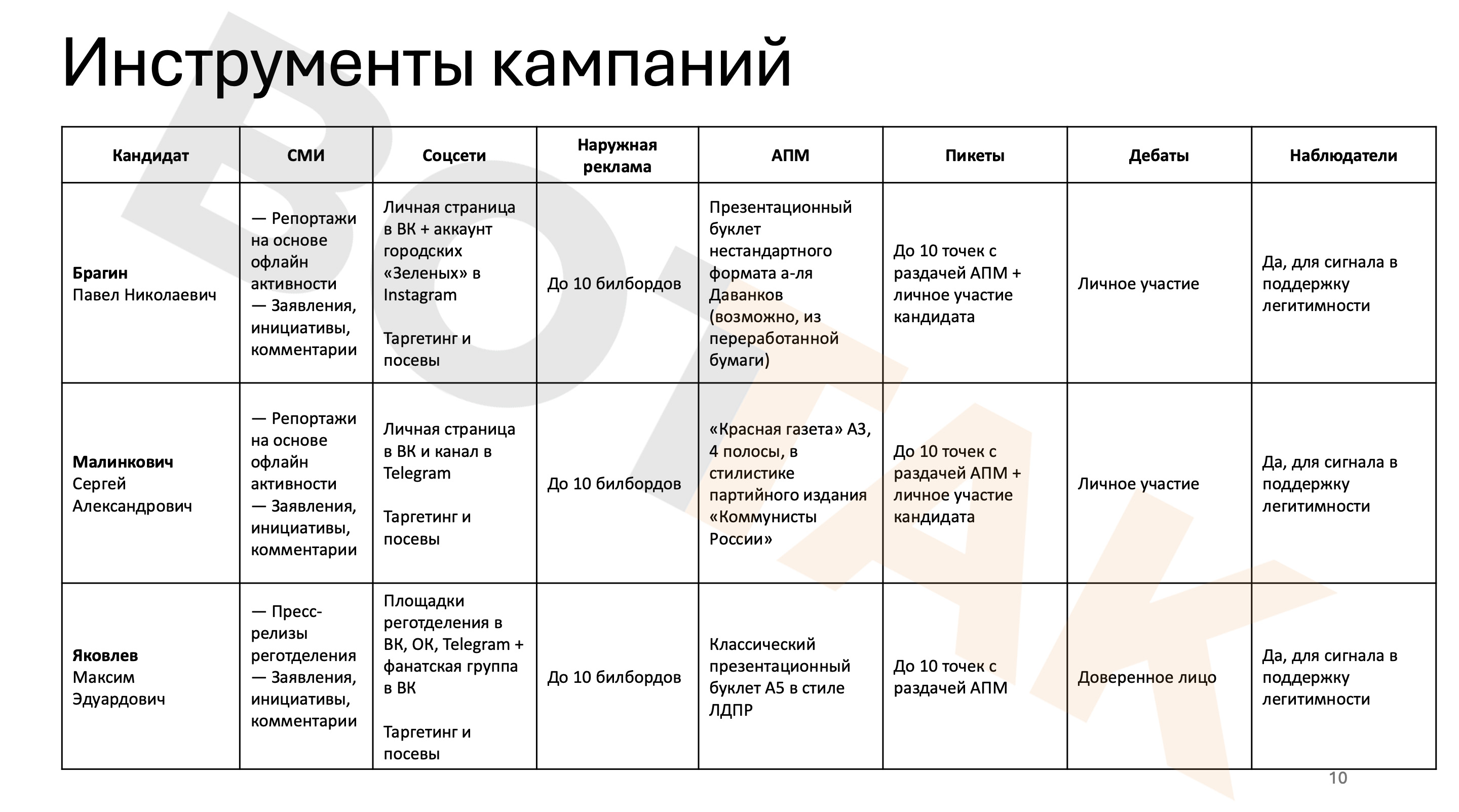 В презентации указаны также условия и задачи кандидатов-спойлеров. Главное из них — невысокая органическая явка. Еще одно — обеспечение легитимности полученного результата. Для этого, по мнению авторов документа, необходимо «правильное легендирование кандидатов и соблюдение традиций стандартной избирательной кампании».