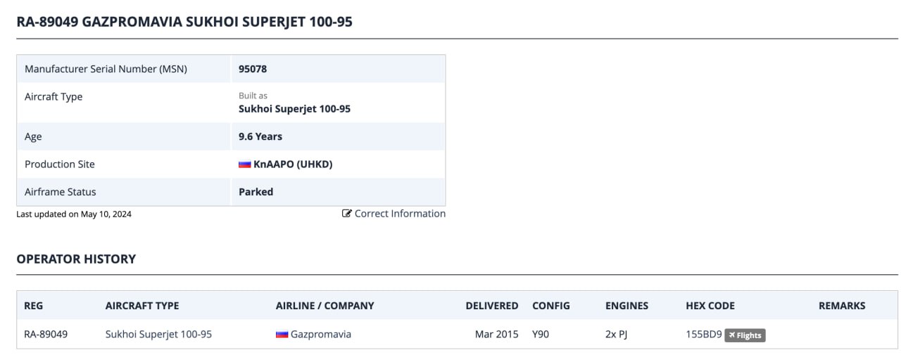 Упавший самолет носил регистрационный номер RA-89049, эксплуатант — «Газпромавиа» с 2015 года. Вероятно, он летал с отключенным транспондером, так как, согласно сервису Flightradar24, его последний полет состоялся 3 мая.