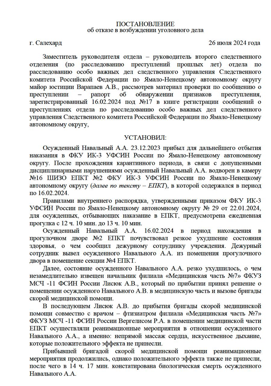 Спустя полгода после убийства Алексея Навального Следственный комитет прислал официальное постановление о его смерти. Согласно этому документу, который опубликовала Юлия Навальная, смерть Навального не носит криминального характера, а является следствием «комбинированного заболевания» и наступила в результате «аритмии». Поэтому СК отказался заводить уголовное дело по факту смерти политика.