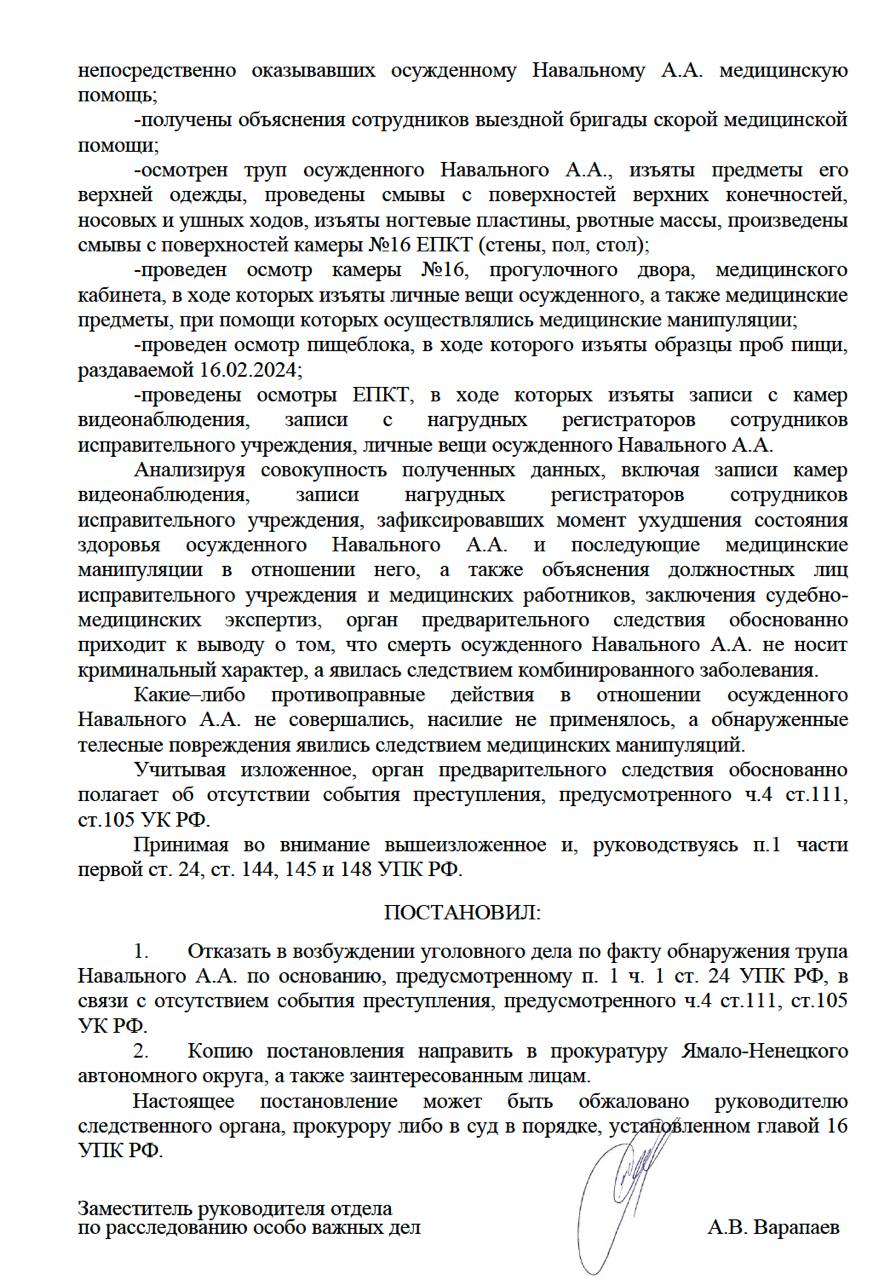 «Это постановление Следственного комитета по Ямало-Ненецкому автономному округу. Подписано тем самым майором Варапаевым, который отказывался отдать тело Алексея семье и шантажировал его мать, чтобы та согласилась на тайные похороны. (...)Я знаю, что это неправда. Я знаю, что в постановлении Варапаева вранье и они скрывают реально произошедшее в этот день. Нам прекрасно известно, что, когда Алексею стало плохо, его повели не в медсанчасть, а обратно в камеру ШИЗО. Что умирал он там, один. Что в медсанчасть его отнесли уже без сознания. Что в последние минуты перед смертью он жаловался на острую боль в животе. Почему этого всего нет в постановлении СК? Где съемки с камер, которыми в колонии утыкано все, включая туалеты? Где съемки с нагрудных регистраторов сотрудников колонии, которые запирали умирающего человека в бетонной коробке ШИЗО?»
